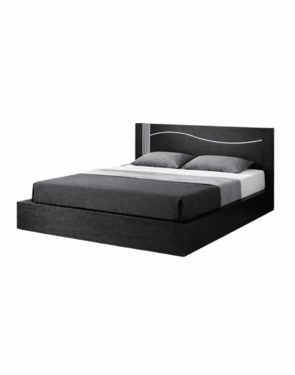 A premium dark-finish platform bed featuring a contemporary headboard with elegant silver accents. Engineered for lasting durability and stability, its sleek, low-profile design brings a sophisticated and modern look to any bedroom interior.
