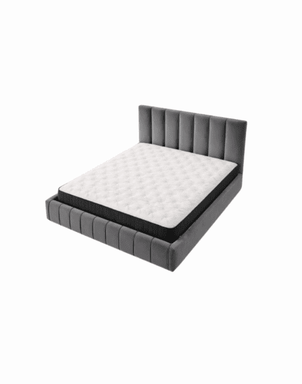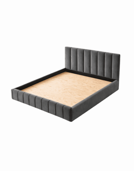 A premium upholstered bed with a solid acacia wood frame and vertical panel headboard, designed for modern luxury, comfort, and lasting durability.