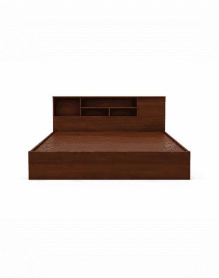 A modern solid wood bed featuring a sleek design with a functional storage headboard. Crafted for durability and everyday convenience, it combines clean aesthetics with smart space-saving functionality.