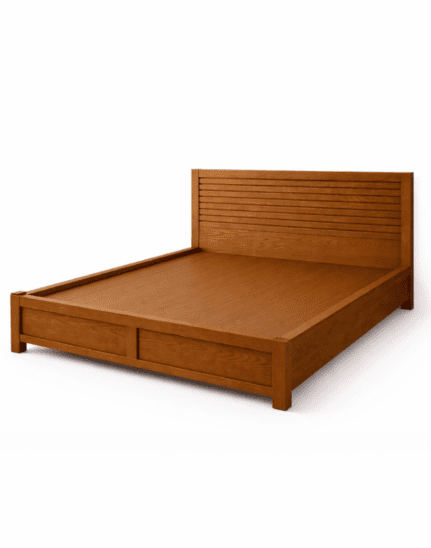 A premium solid wood bed with a minimalist slatted headboard, designed for modern bedrooms seeking durability, comfort, and timeless elegance.
