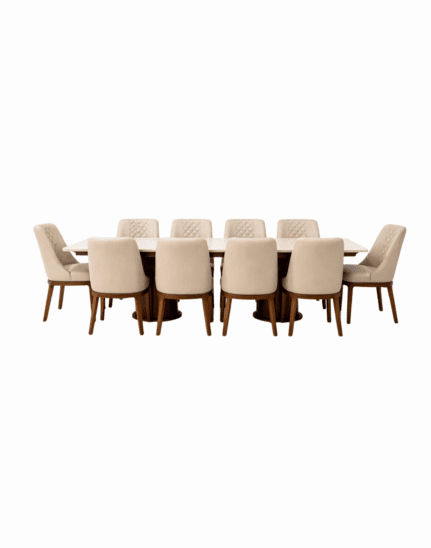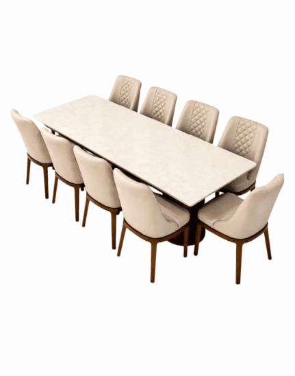 The Elara Acacia Dining Table (DT – 6010) by VANWOOD, Aethercore is a premium dining set crafted from solid acacia wood with an elegant marble tabletop. Paired with six upholstered beige chairs featuring quilted backrests and wooden legs, it blends modern minimalist design with lasting strength and everyday comfort. Built
