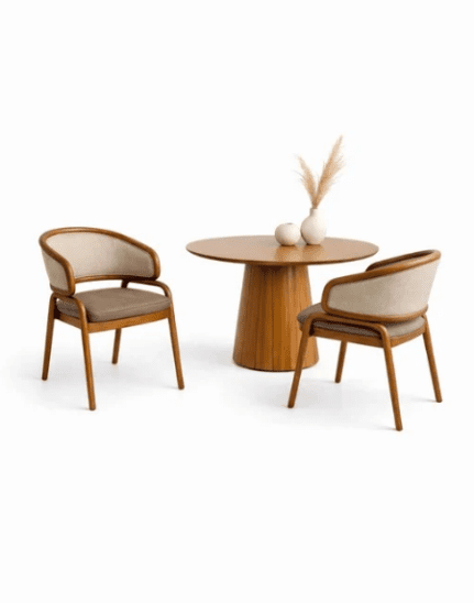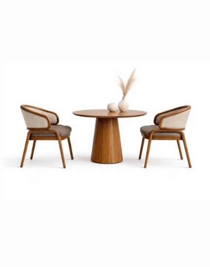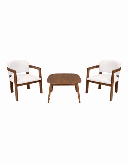 A premium solid wood coffee table set with comfortable upholstered armchairs, designed for modern living spaces with a minimal and elegant aesthetic.