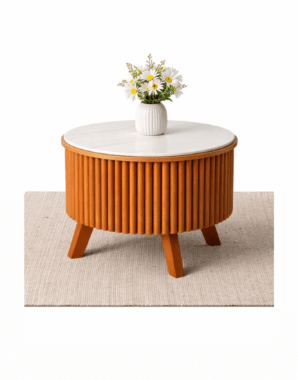 A premium modern coffee table featuring a polished marble top and a solid acacia wood pillar base, designed for refined living spaces with strong, stable construction and timeless appeal.