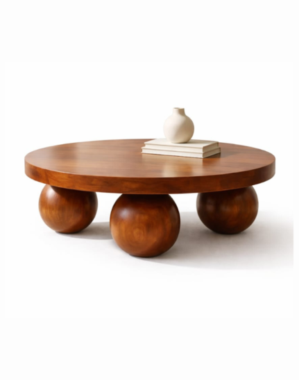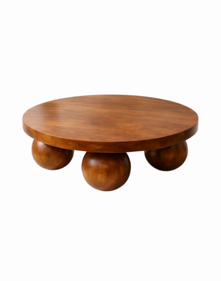 A modern solid wood coffee table featuring a sculptural ball-leg design, crafted from premium acacia wood for minimalist elegance and lasting durability.