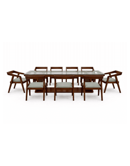 A premium glass dining table featuring a solid acacia wood base and modern minimalist design. Strong, stable, and elegantly crafted for refined dining spaces.