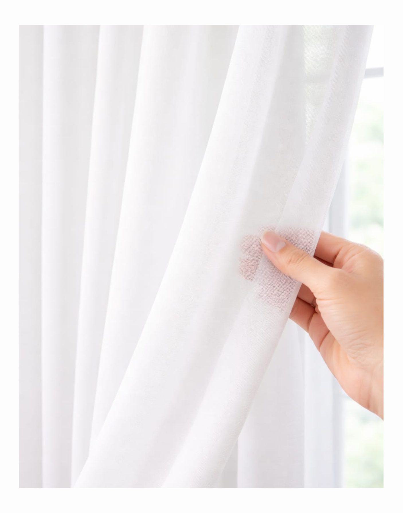 Made from high-quality polyester sheer fabric, the drapes feature a lightweight yet durable weave. Precision stitching ensures clean edges and consistent pleating, while the fabric maintains its structure and softness over time without sagging.