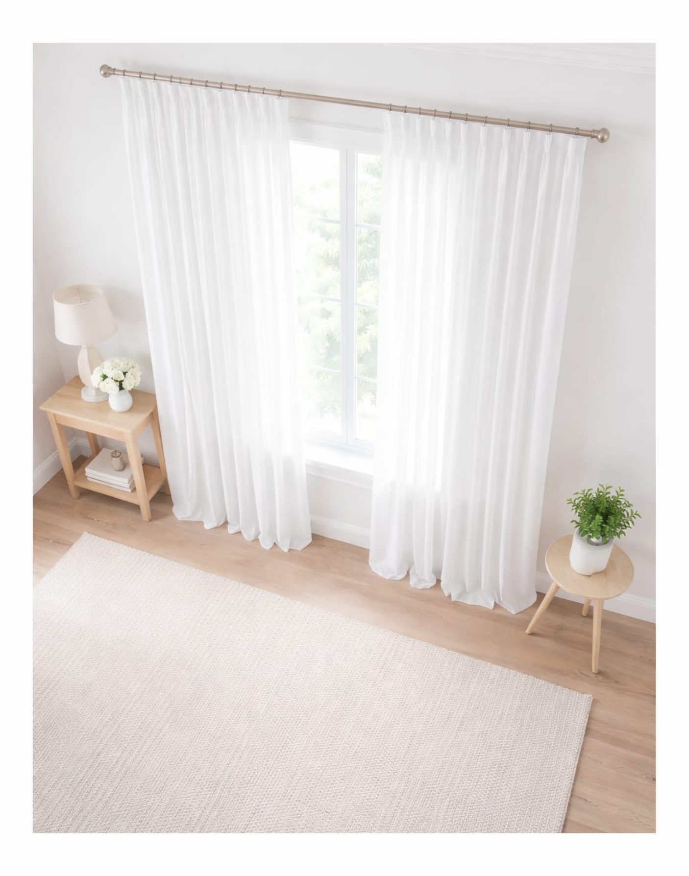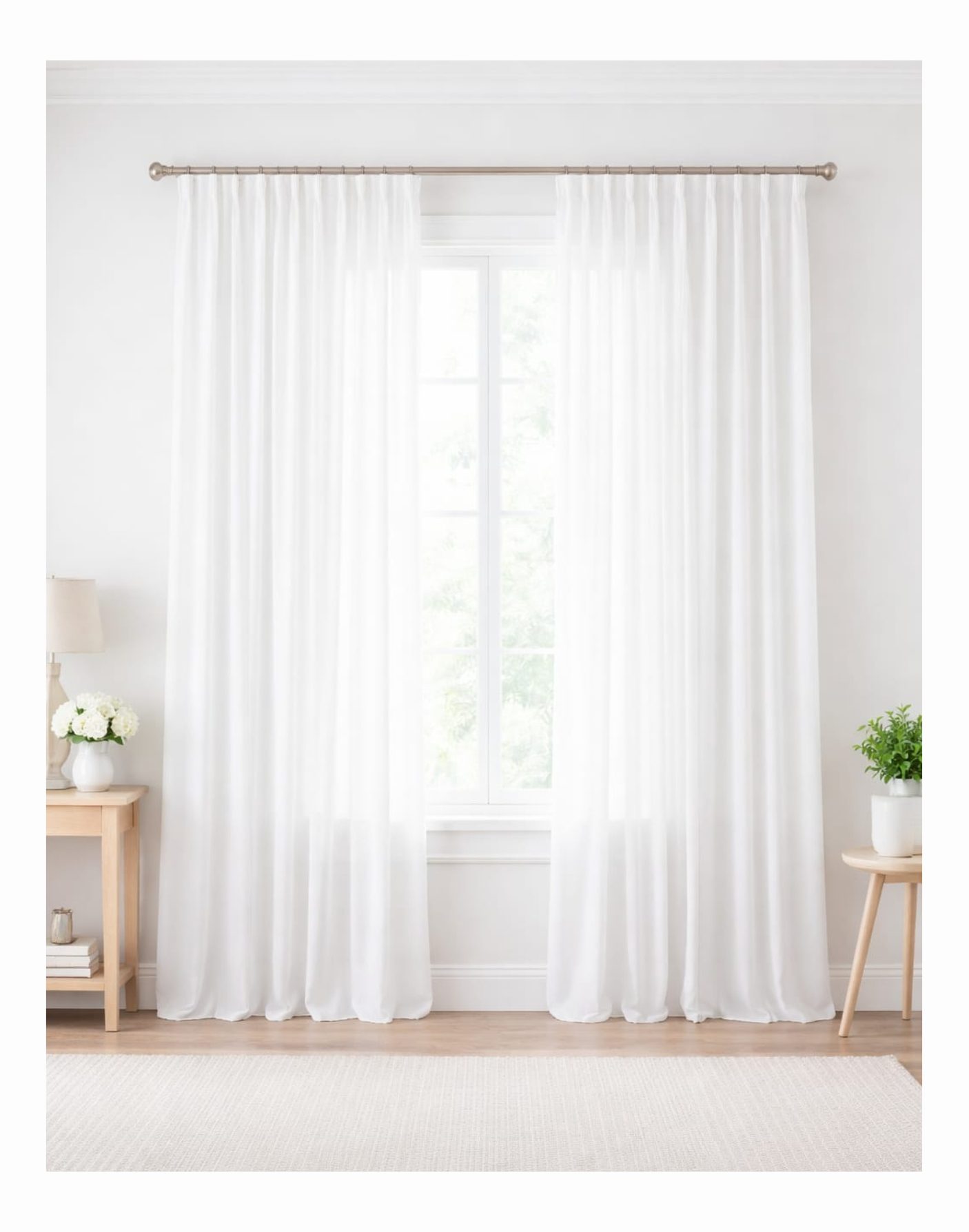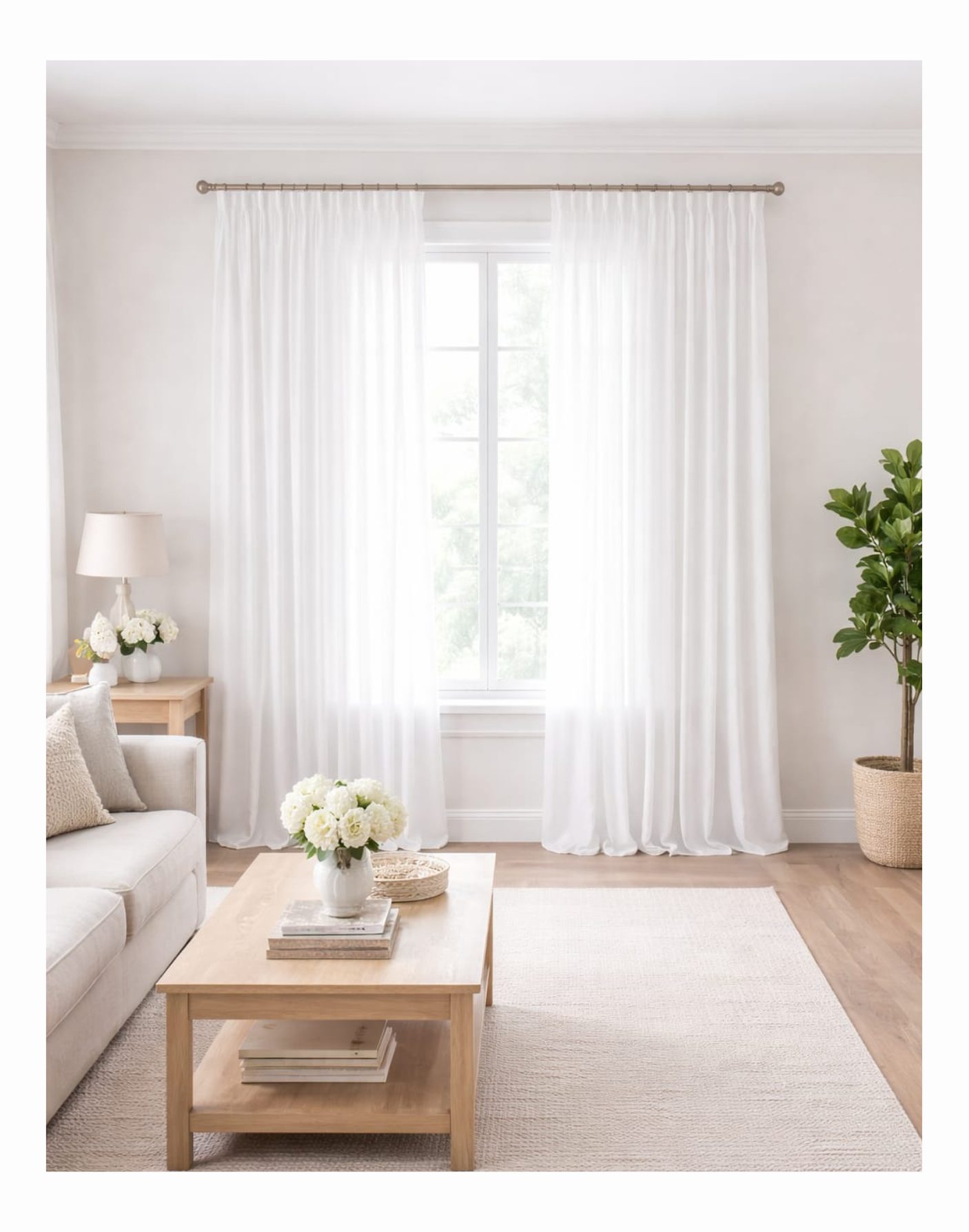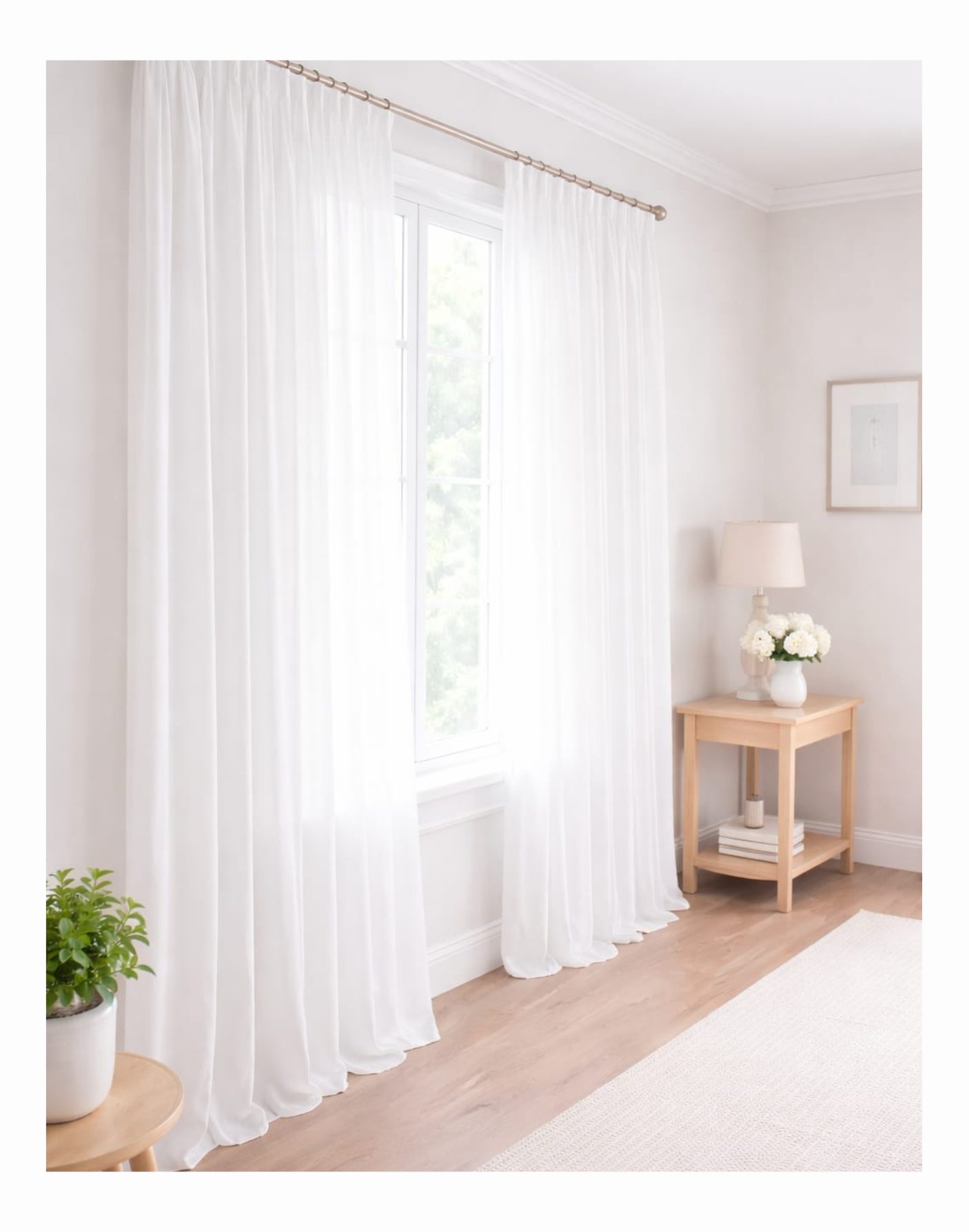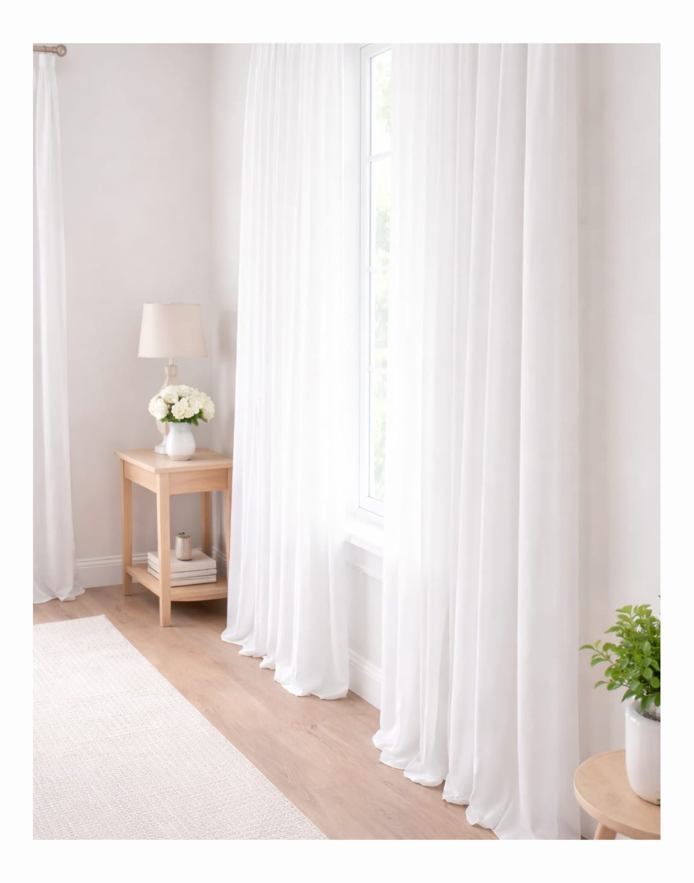 These sheer curtains are designed to visually expand your space by allowing natural light to flow freely. The soft white tone complements neutral palettes, wooden flooring, and modern furnishings, making the room feel larger, calmer, and more refined. Perfect for layering with blackout curtains for a premium designer look.