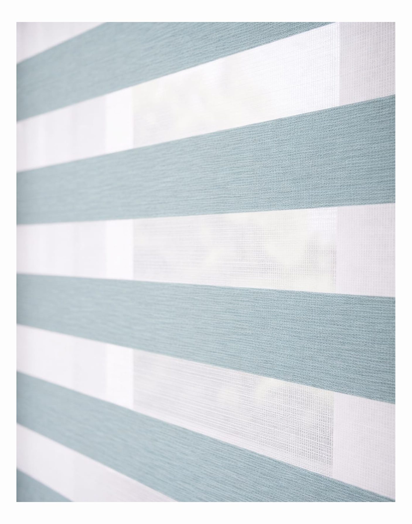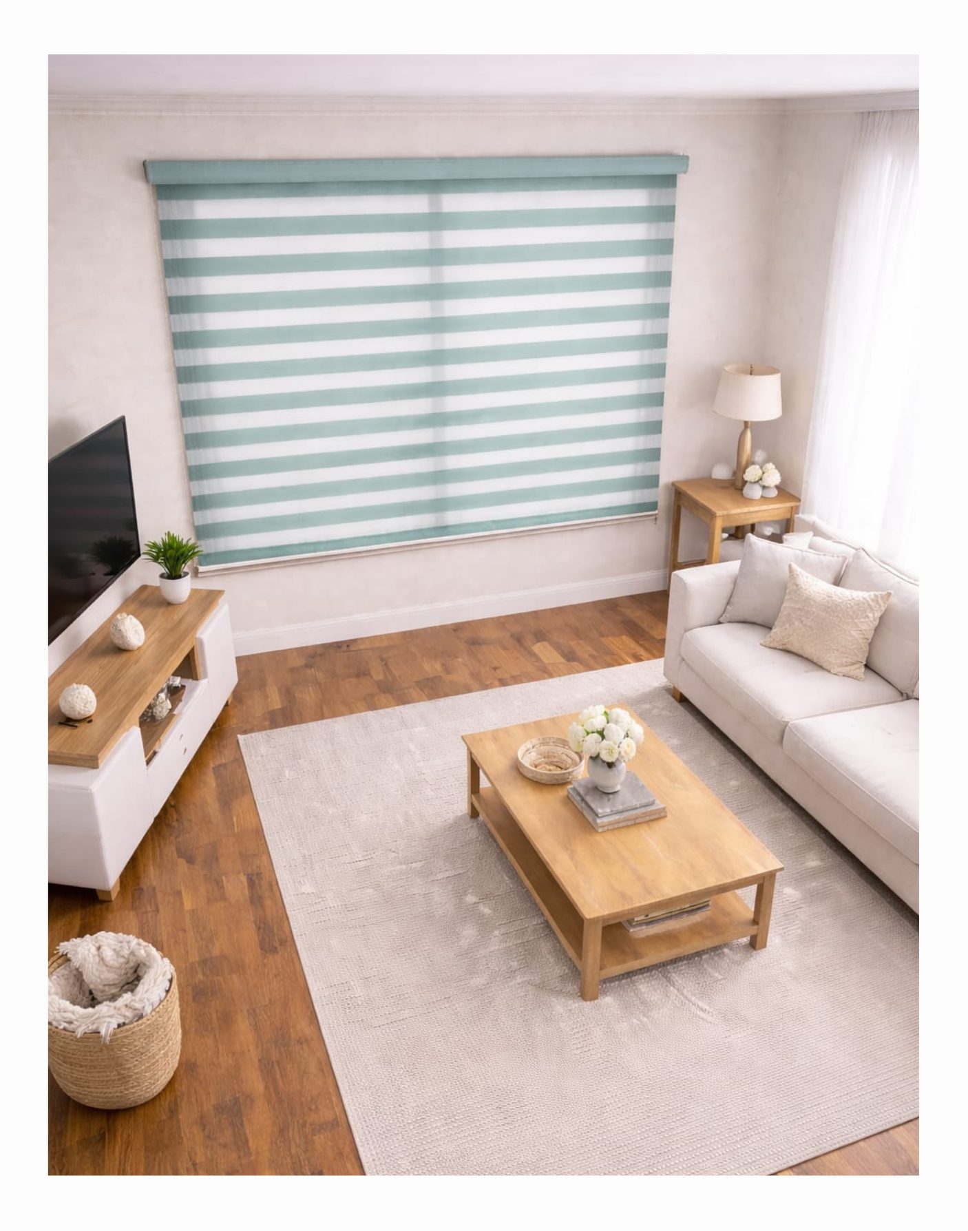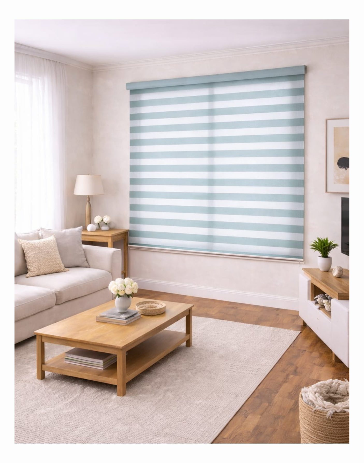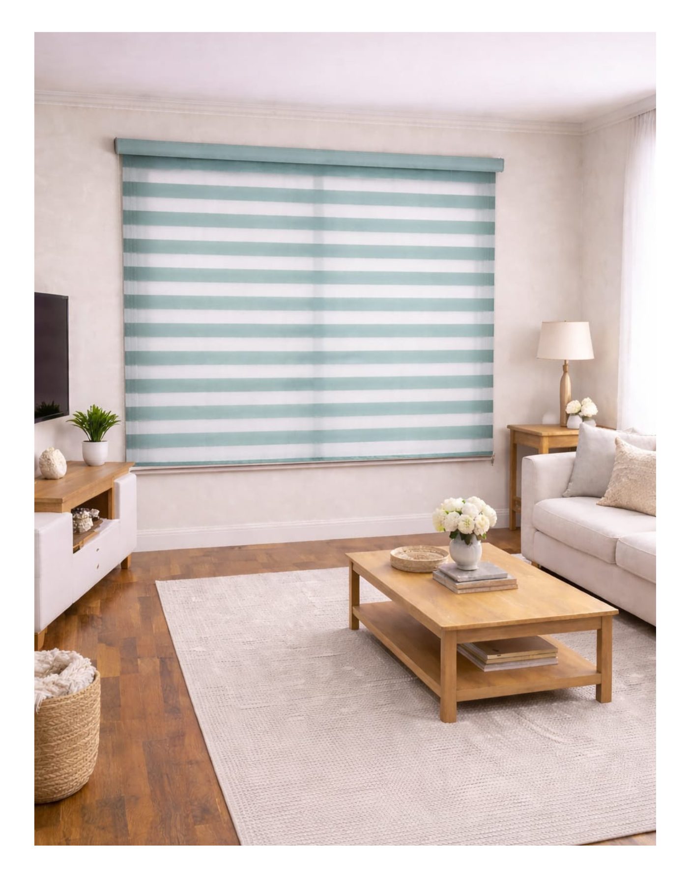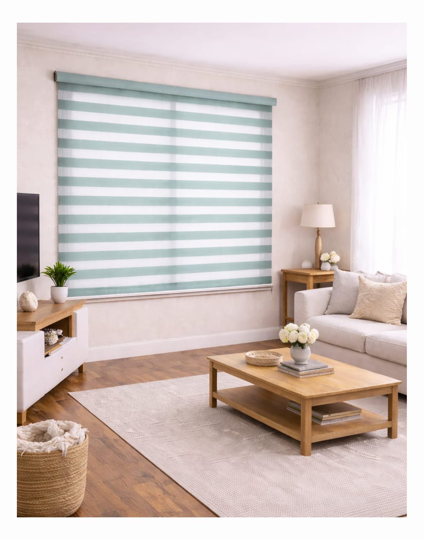 Omega AquaSilk Dual-Zebra Roller Blinds combine contemporary functionality with a soft, refreshing color palette. The alternating sheer and solid fabric layers allow precise control over natural light, letting you shift effortlessly between bright openness and comfortable privacy. The mint green tone adds a light, calming feel—ideal for modern living rooms, bedrooms, and stylish office spaces.