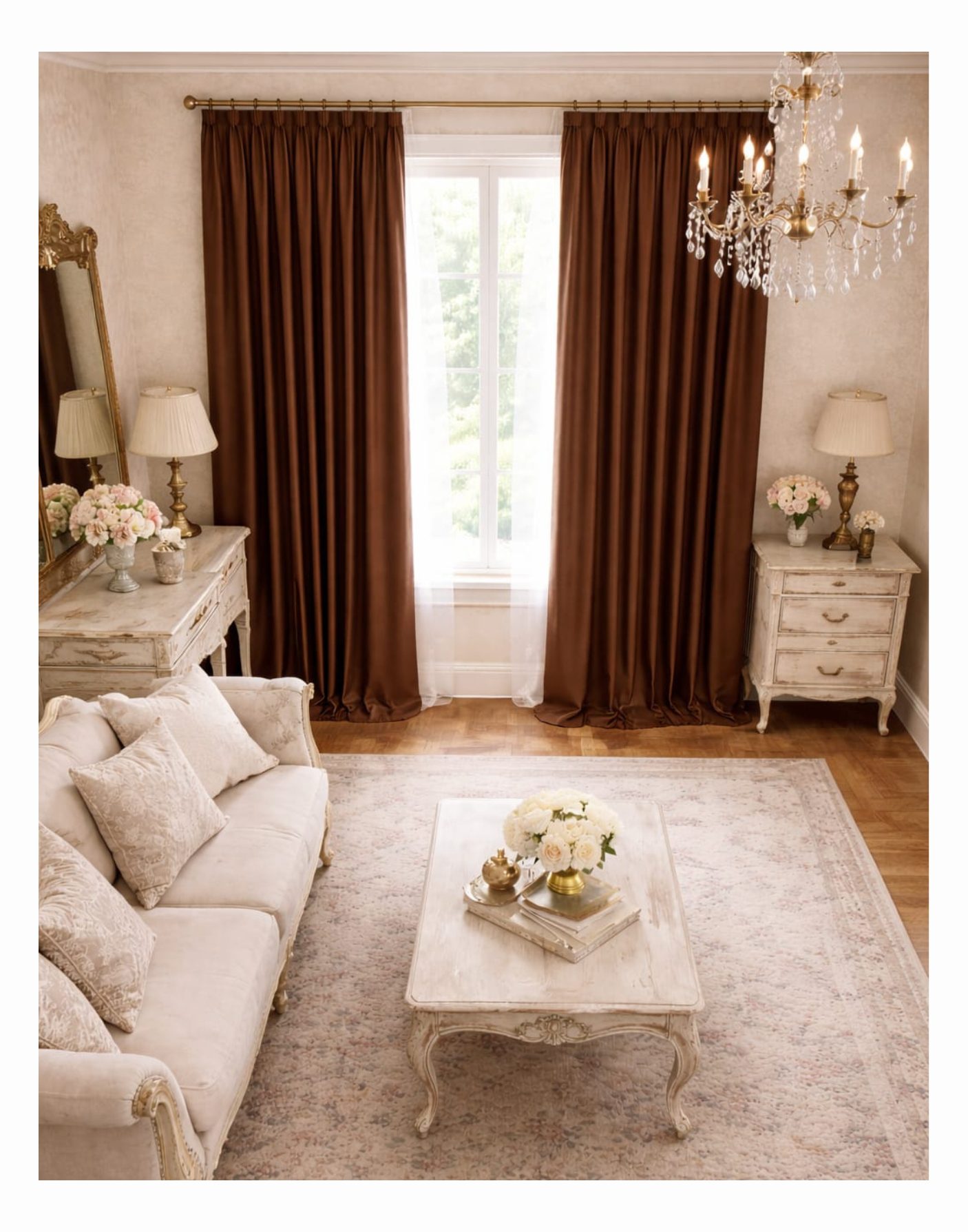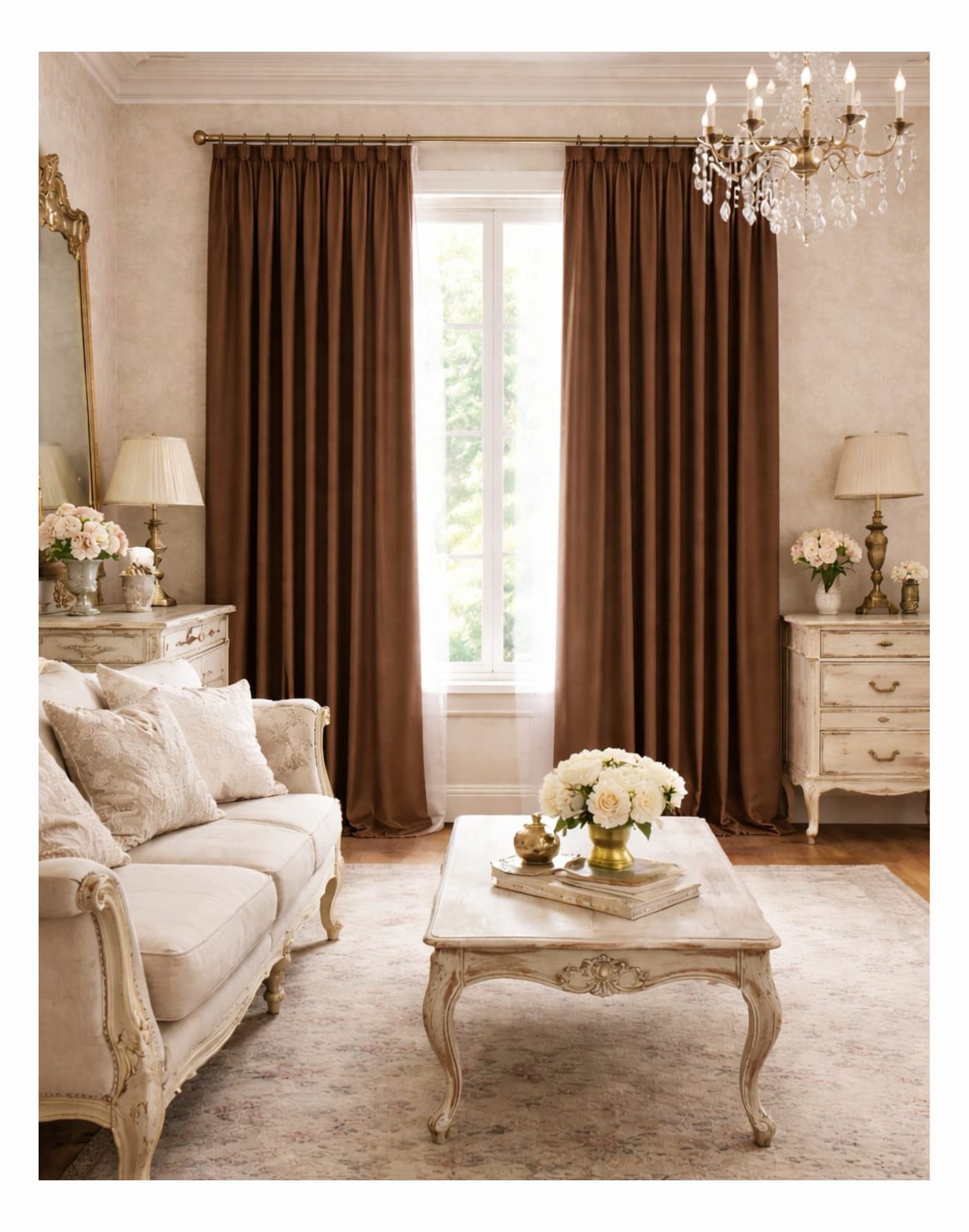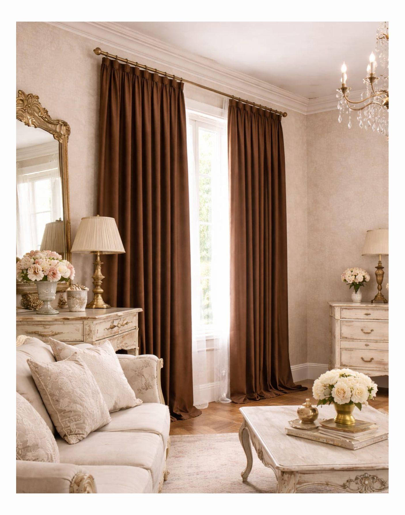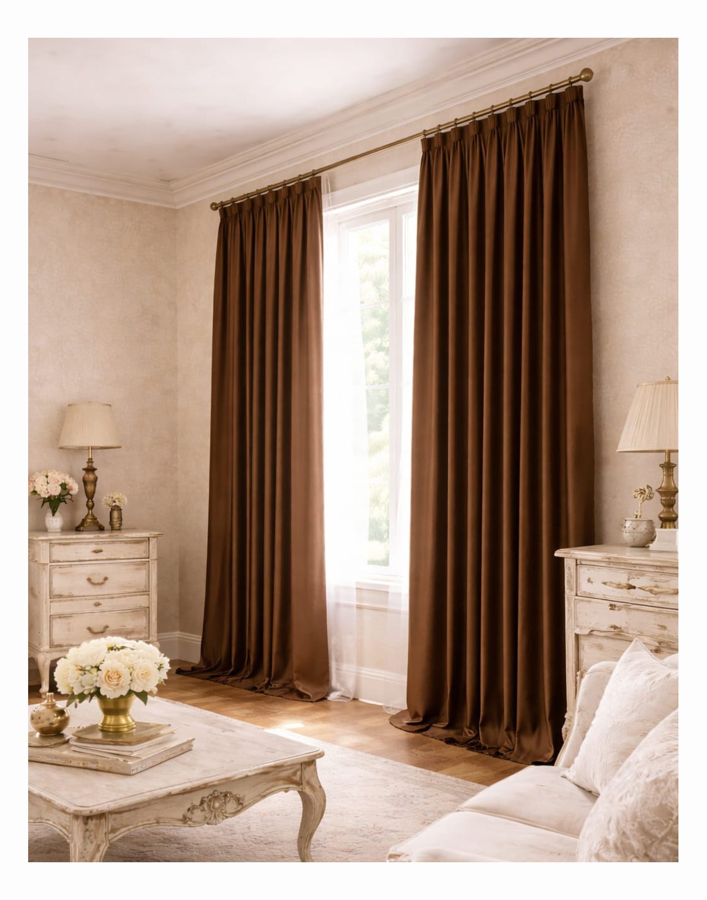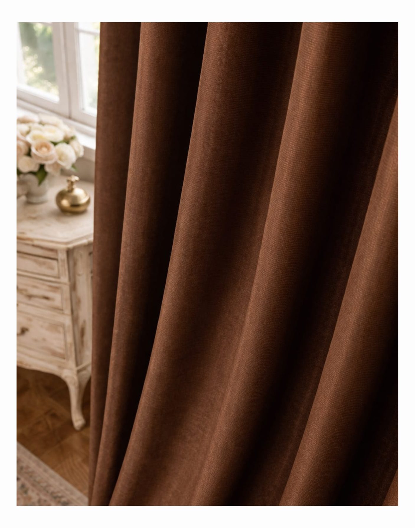 The deep cocoa brown tone adds warmth, depth, and a sense of richness to interiors. Ideal for classic, vintage, or luxury-themed spaces, these curtains create a cozy yet sophisticated ambiance while complementing neutral and gold-toned décor beautifully.