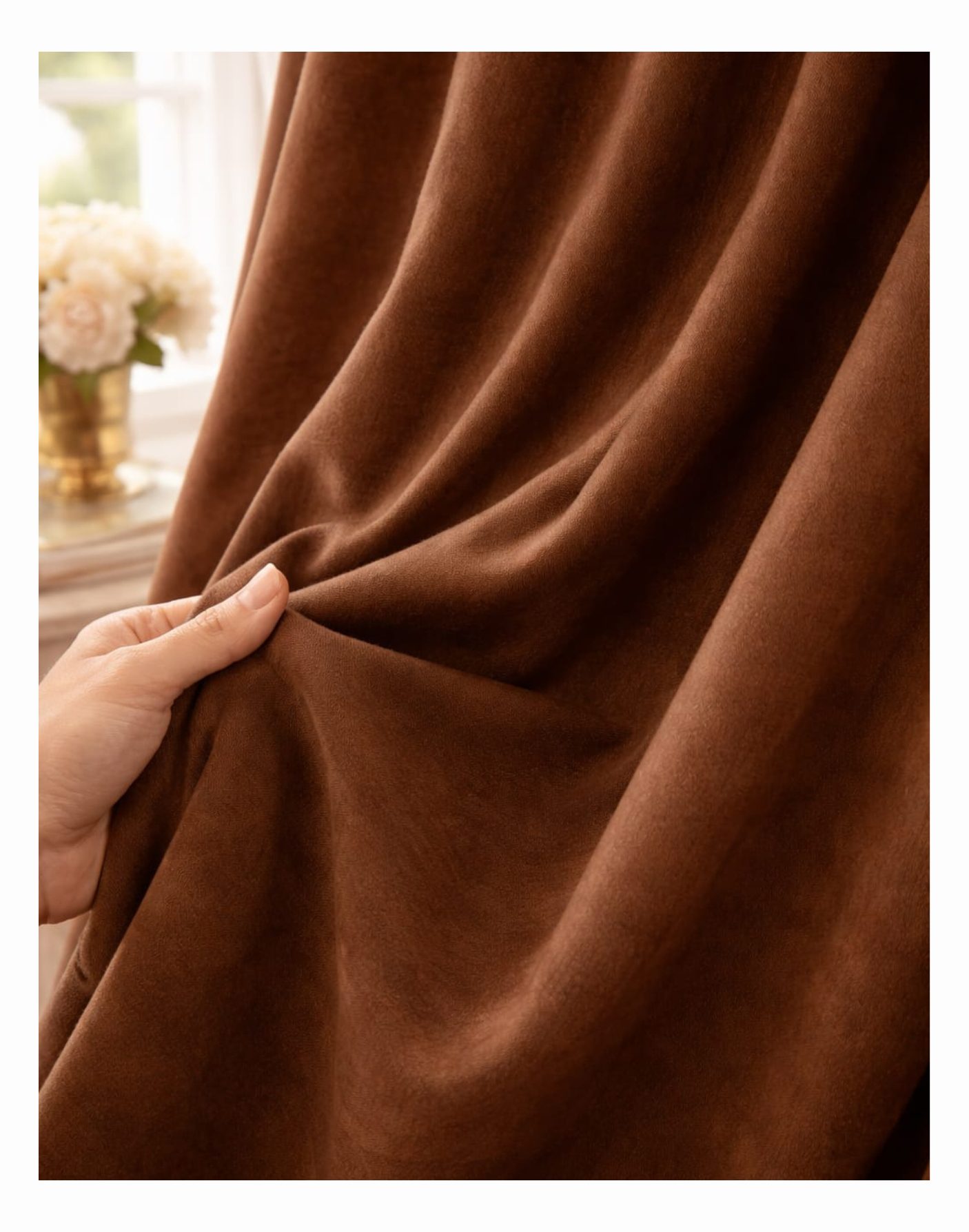 Elevate your interiors with Omega CocoaVelour Curtains, crafted in a rich brown tone with a luxurious velvet finish. Designed for superior light blocking and timeless elegance, they bring warmth and sophistication to any space.