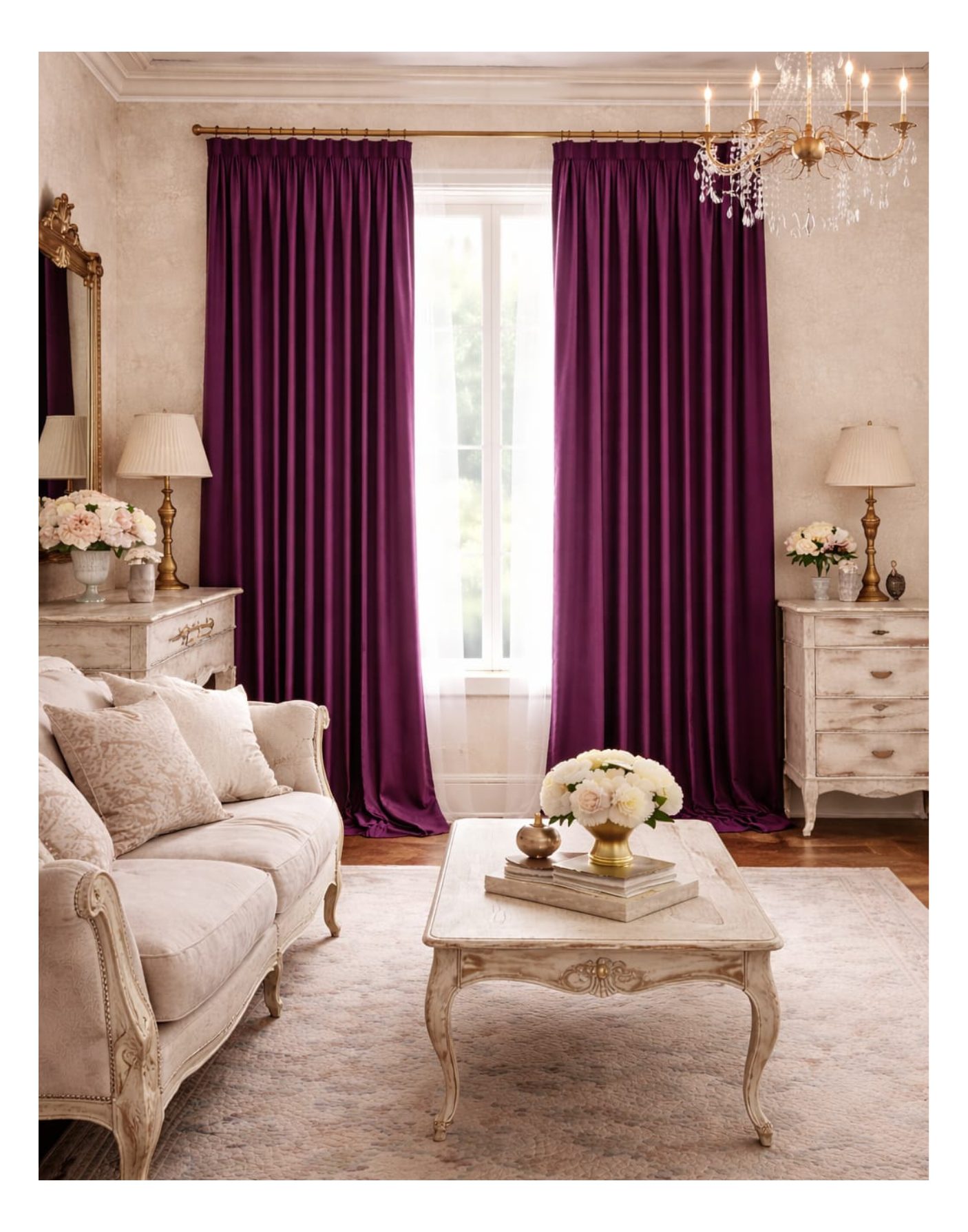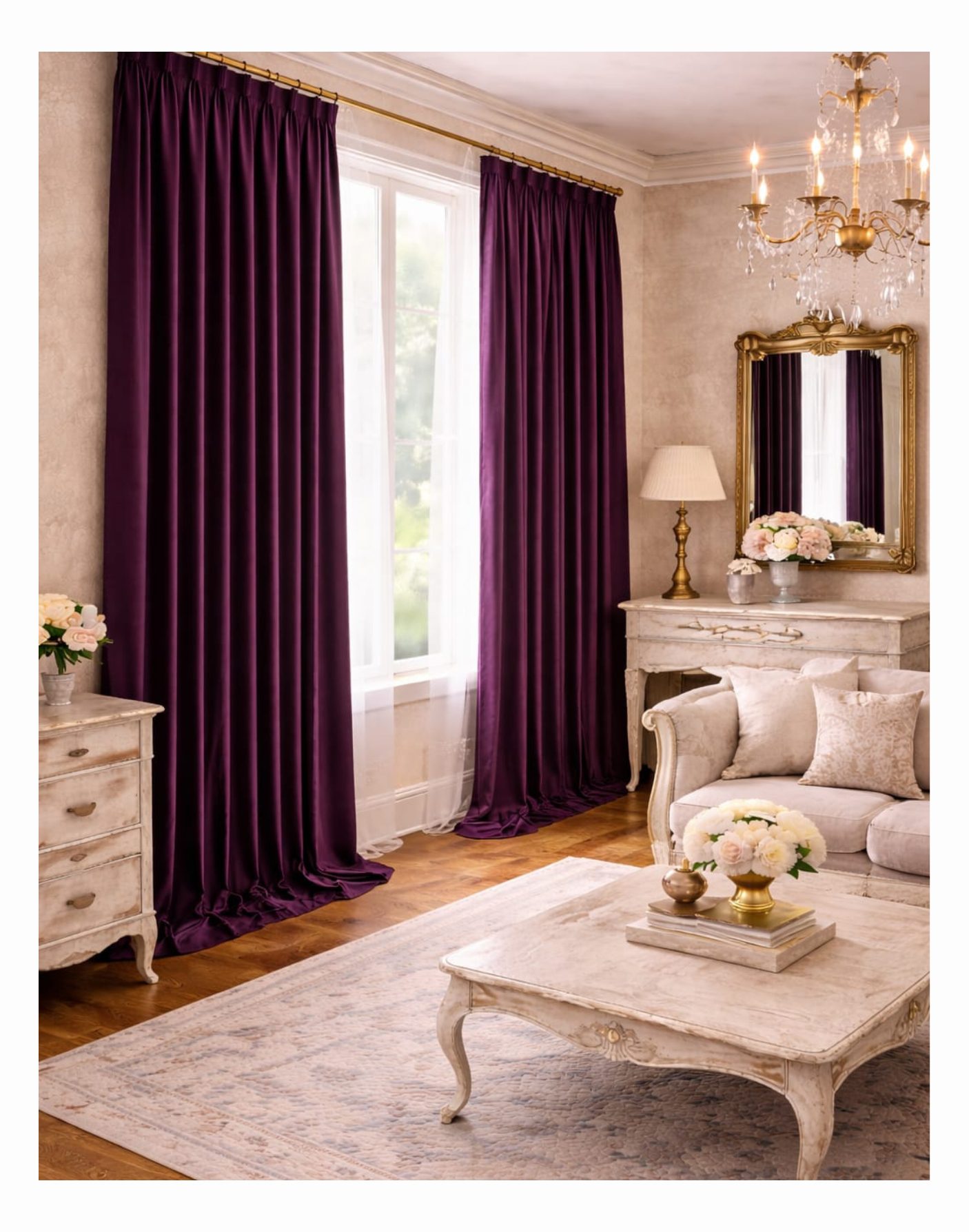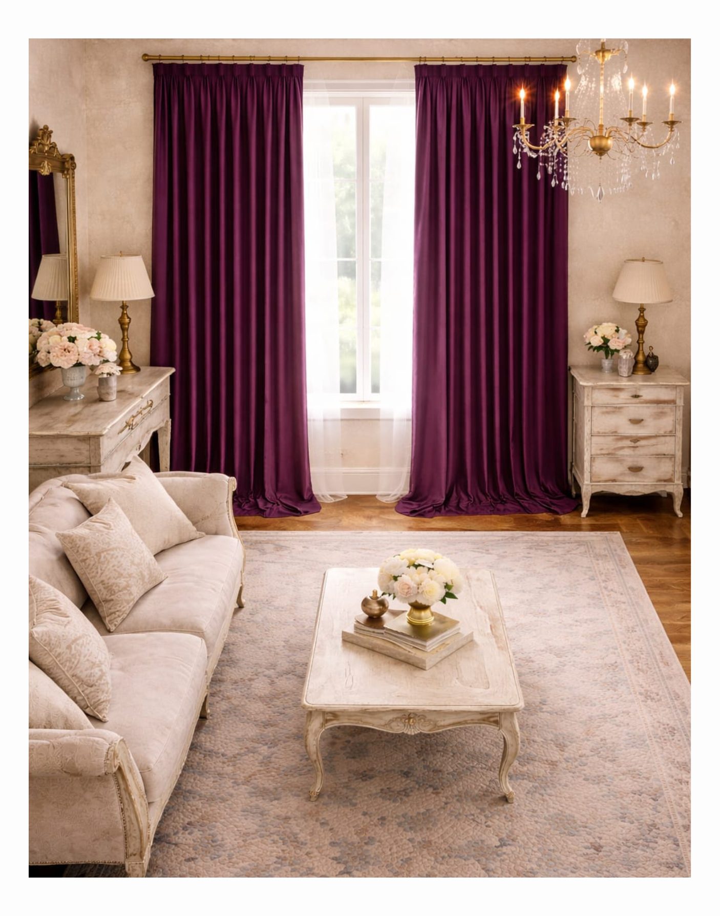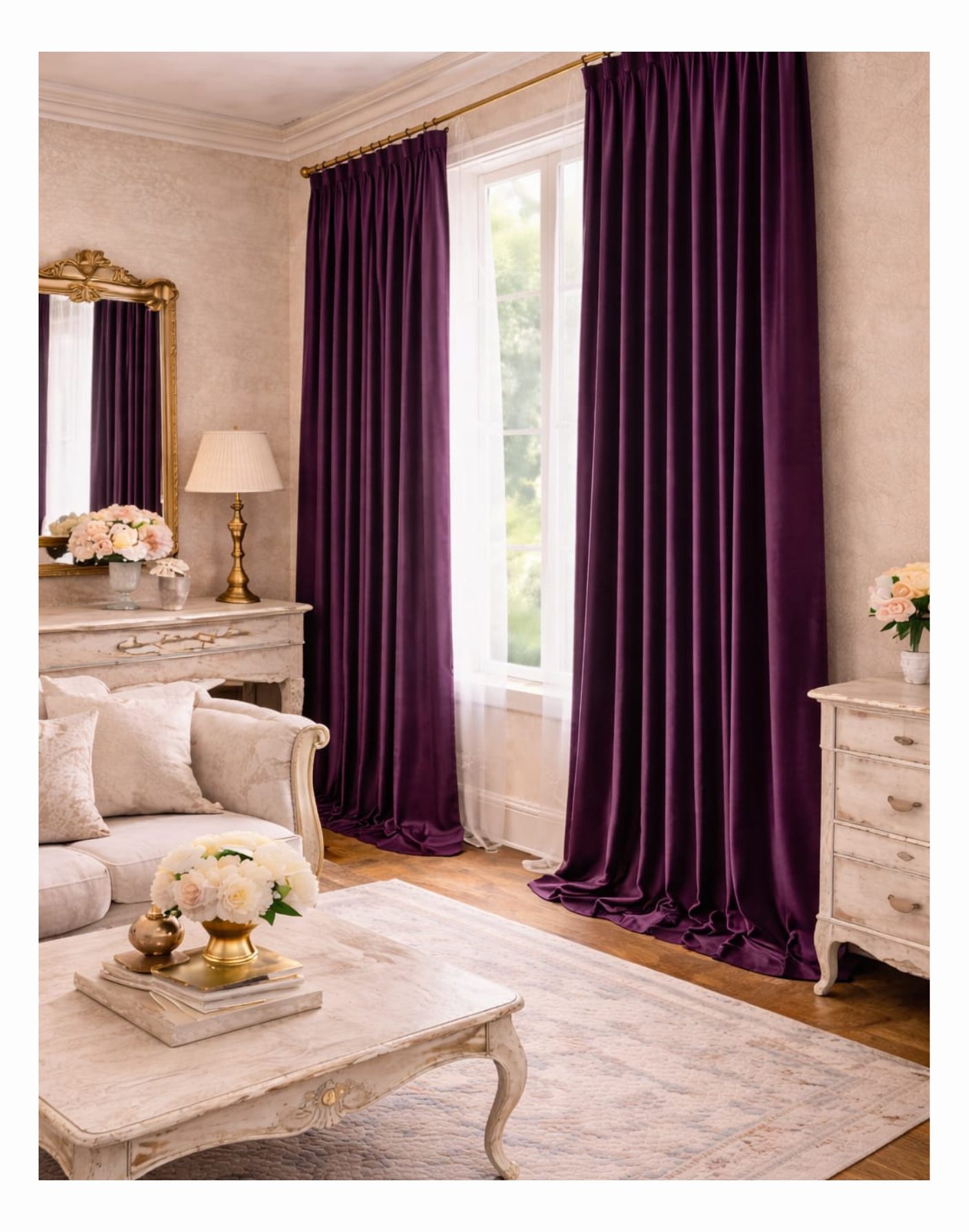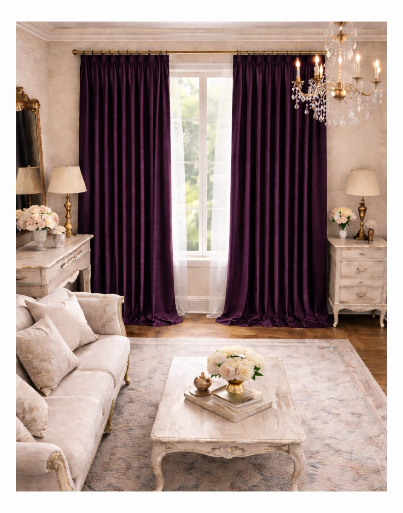 Constructed using a high-density velvet polyester blend, these curtains offer excellent durability, wrinkle resistance, and color retention. Precision tailoring ensures uniform pleats and a flawless finish that maintains its structure over time.
