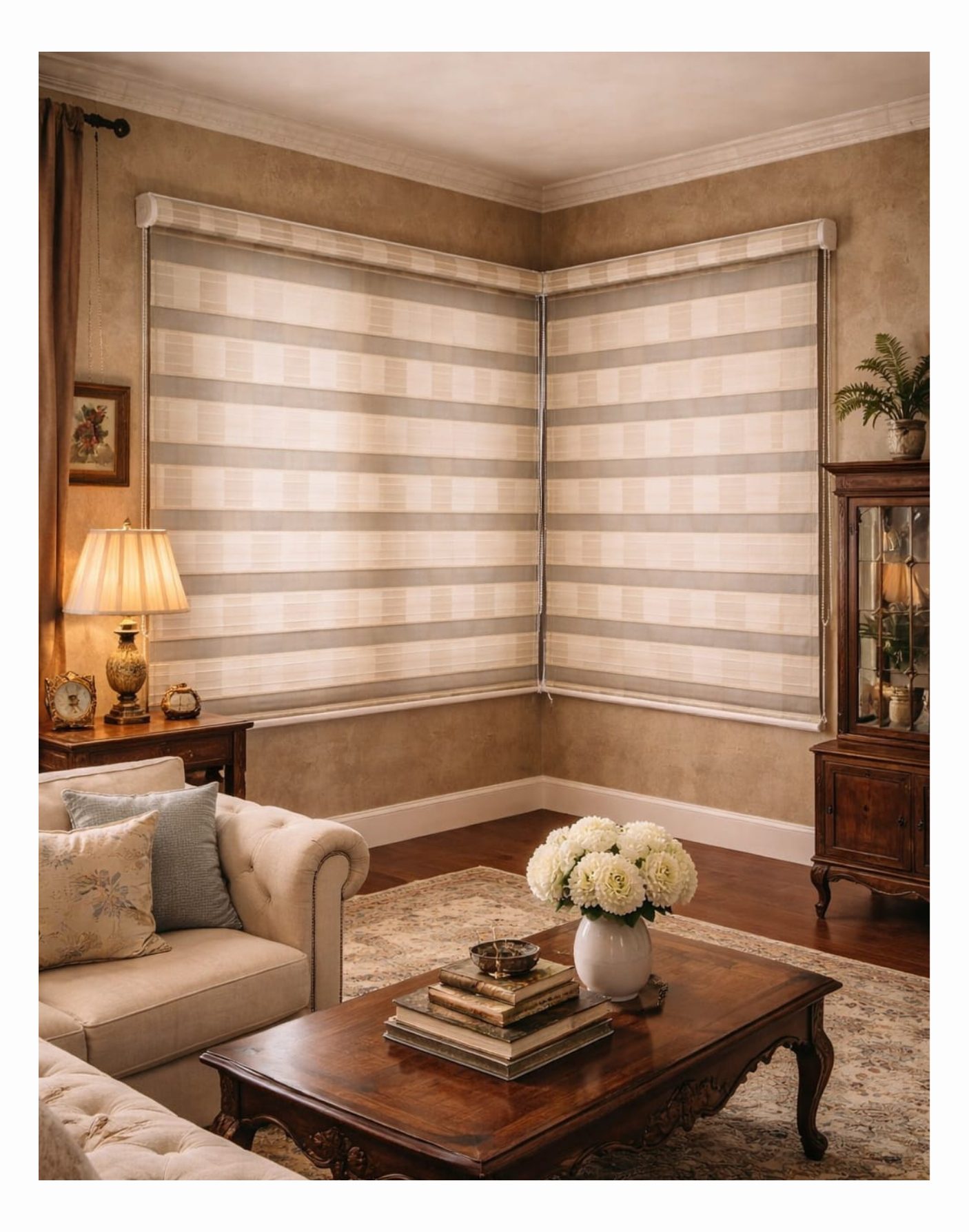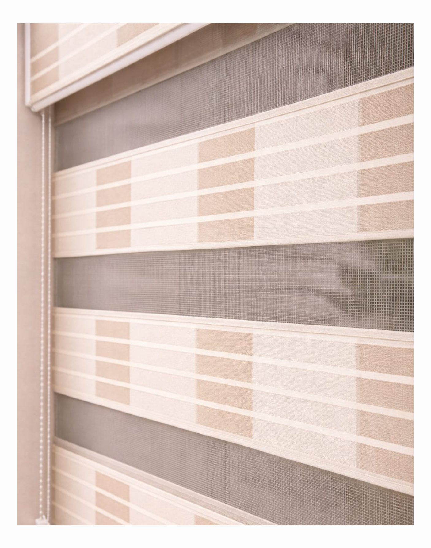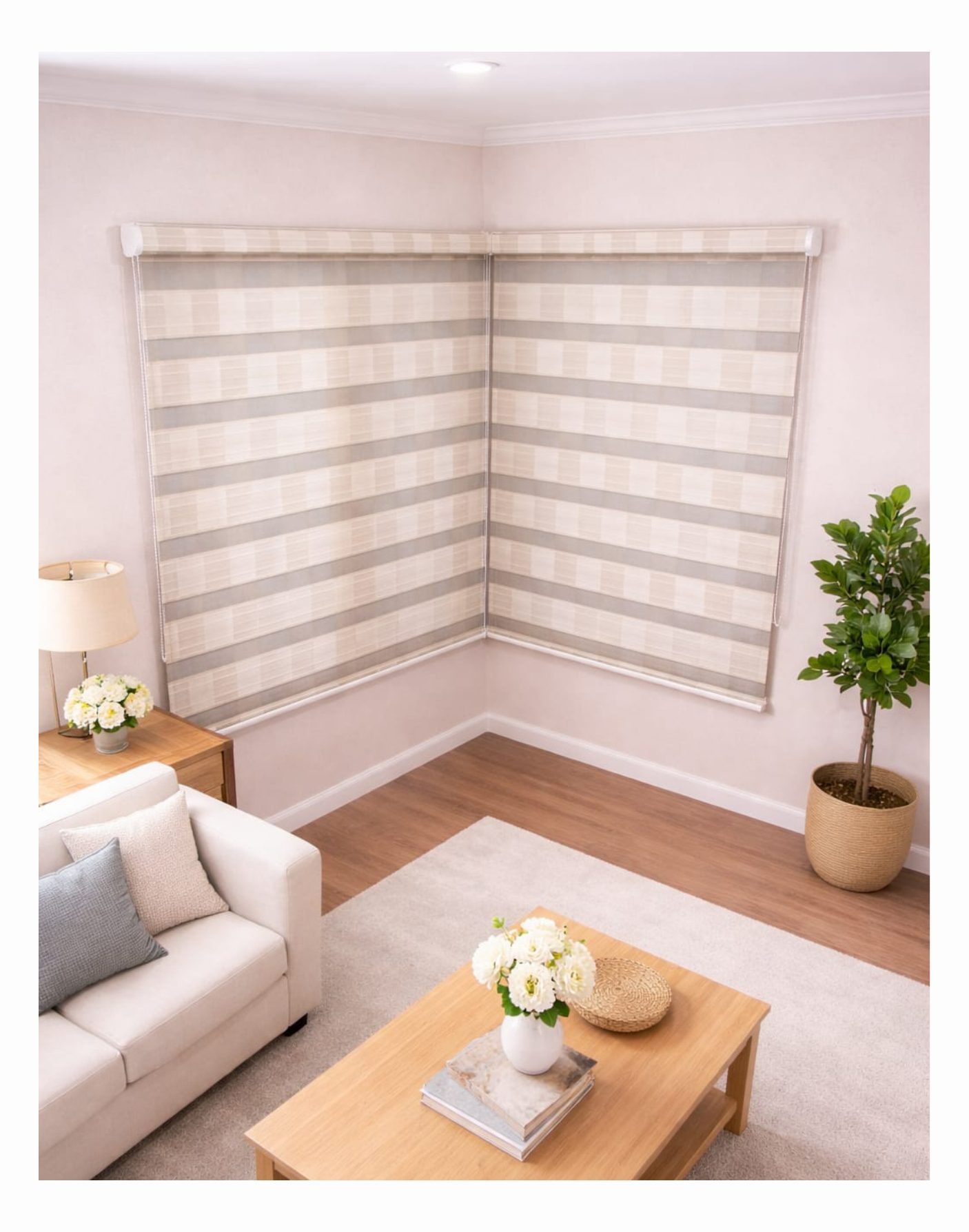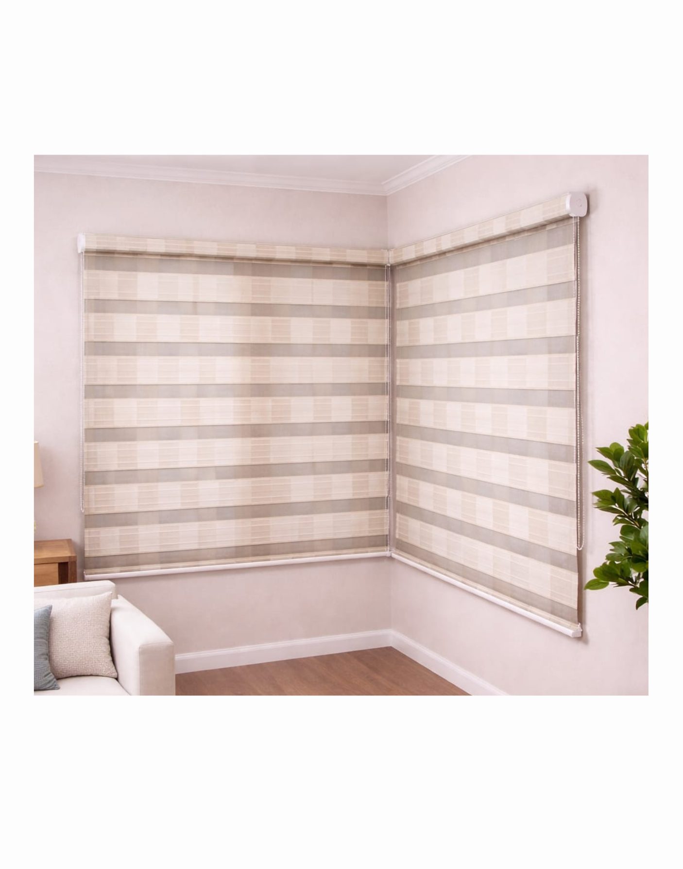 Omega SandLuxe Dual-Zebra Roller Blinds are crafted for spaces that demand both functionality and understated elegance. The layered combination of sheer and opaque fabric bands allows you to precisely control natural light while maintaining privacy. The warm beige tone blends seamlessly into both modern and classic interiors, making it a versatile choice for living rooms, bedrooms, and refined office settings.