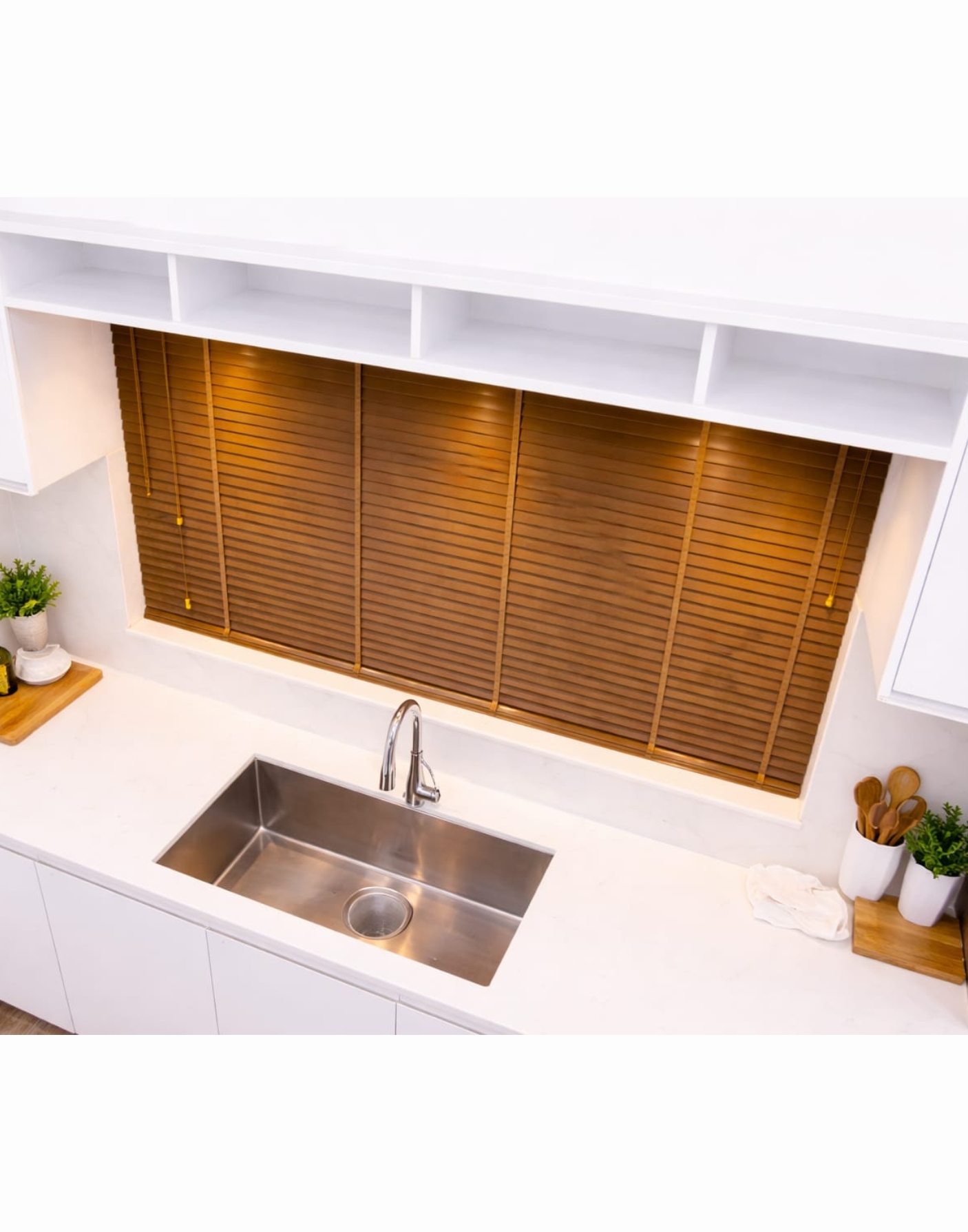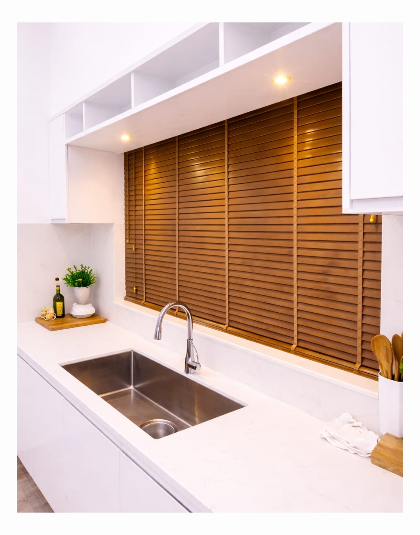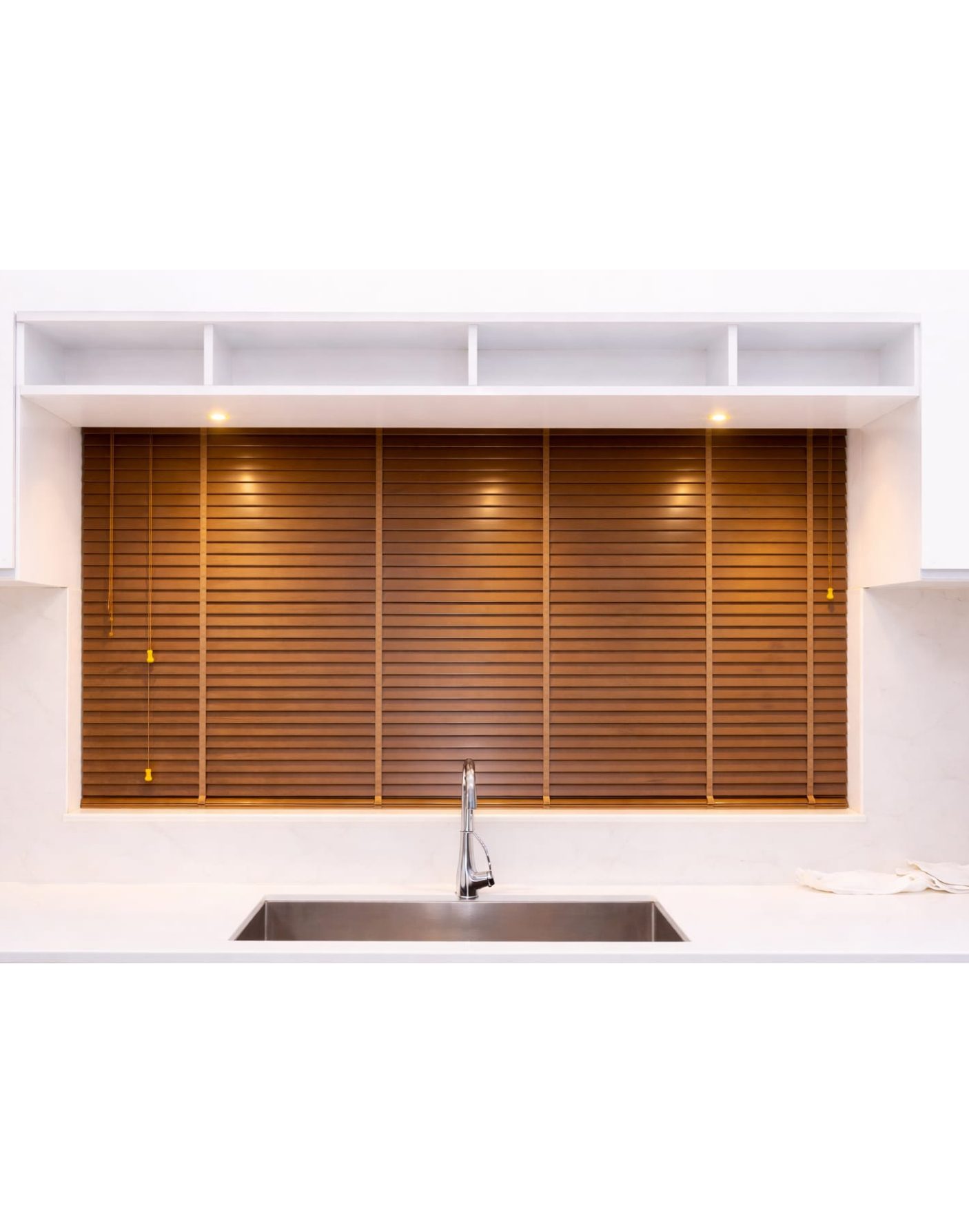 The warm teak tone adds depth and richness to bright, minimal interiors—especially kitchens with white cabinetry. The horizontal slat design creates a structured, elegant look while allowing soft light to filter through, enhancing comfort and visual appeal.