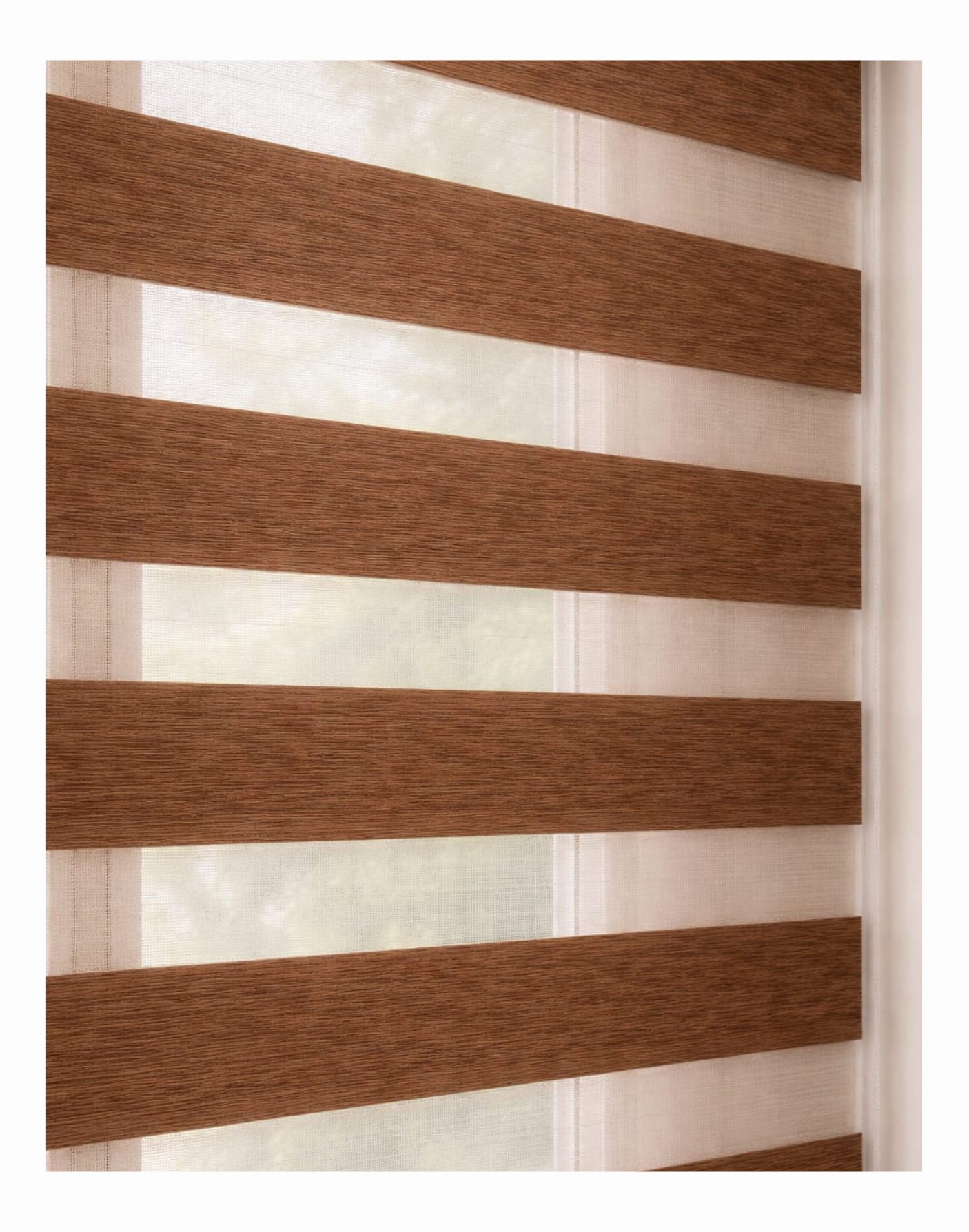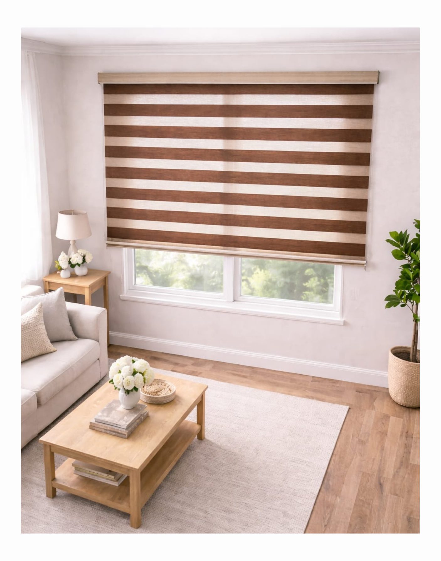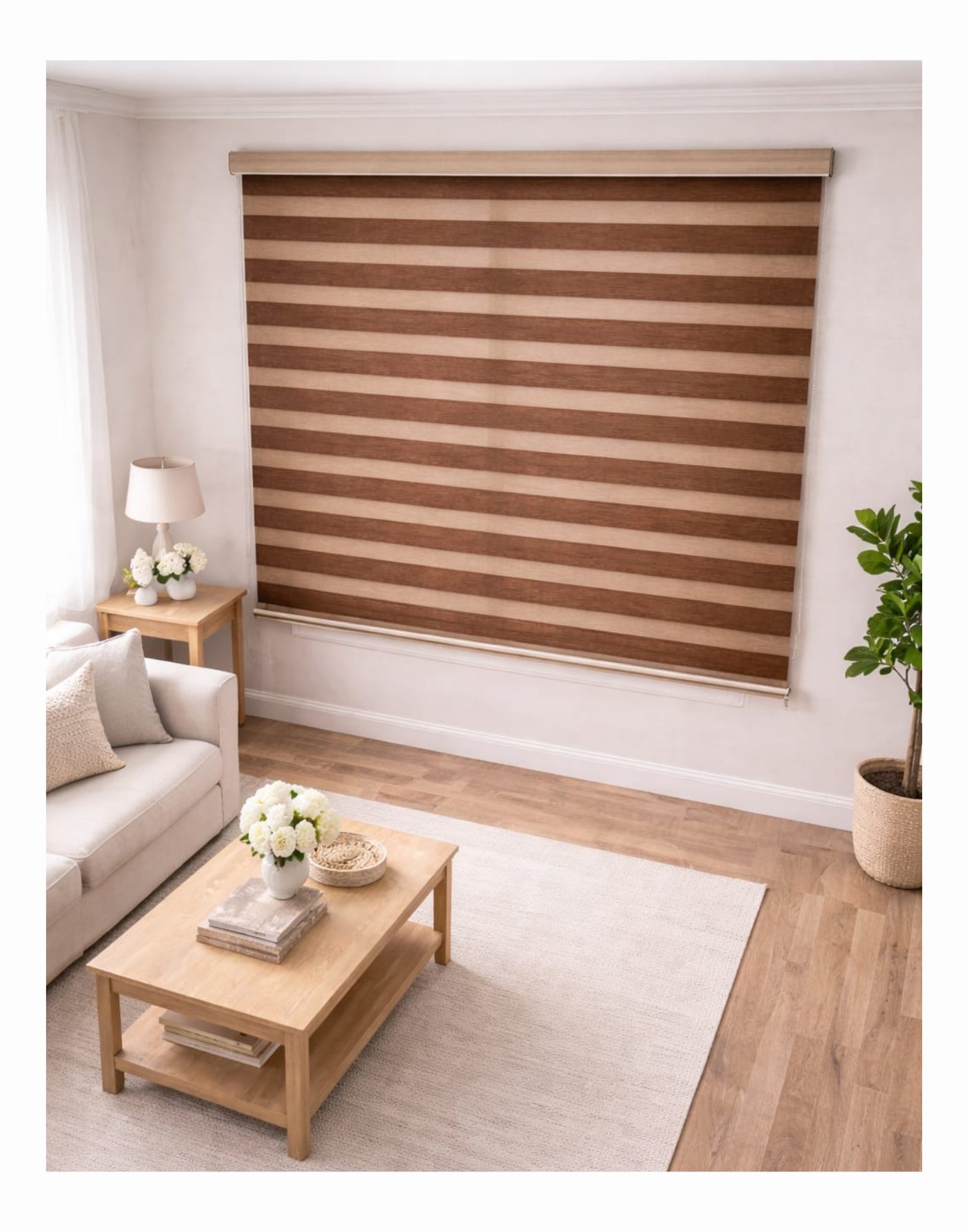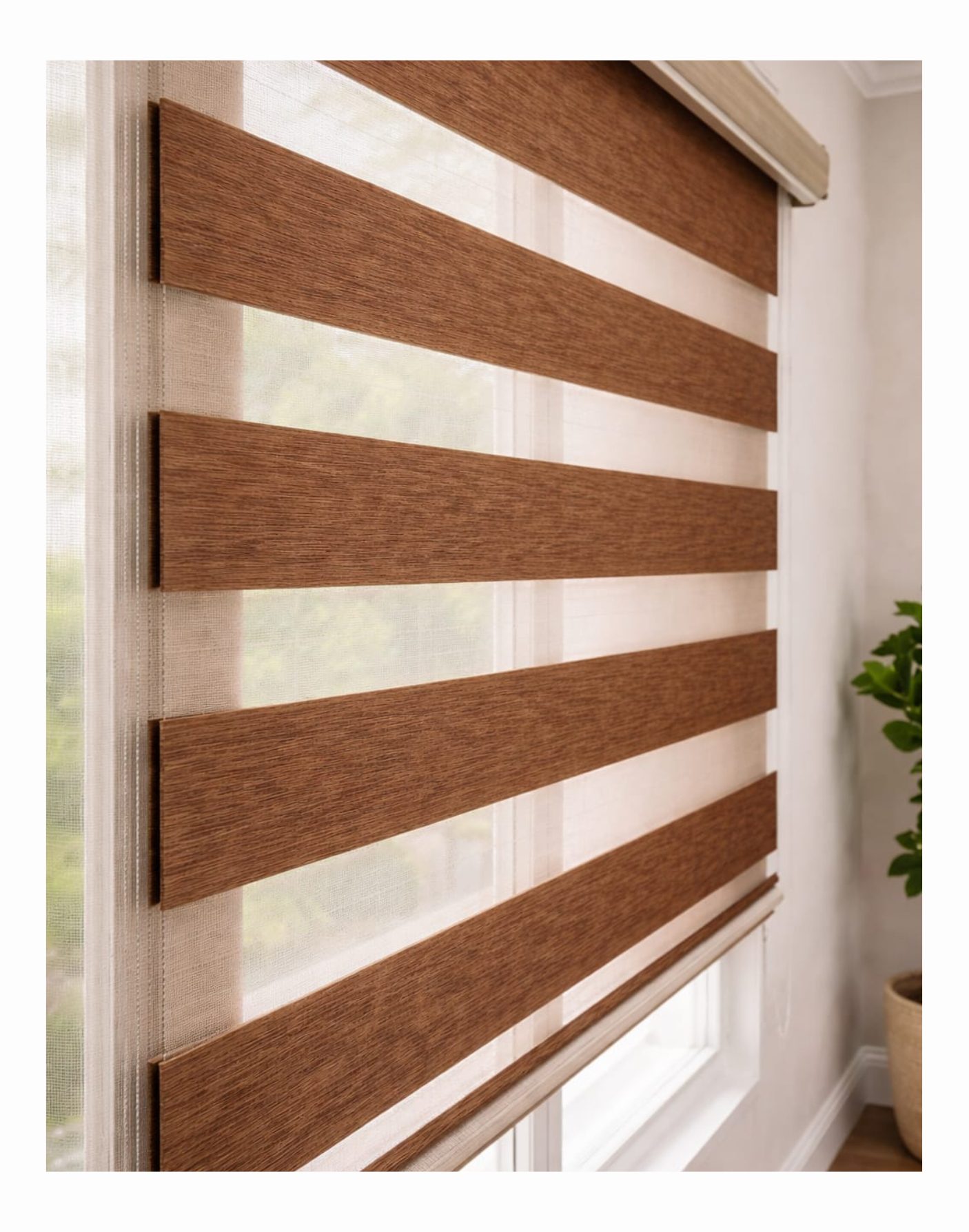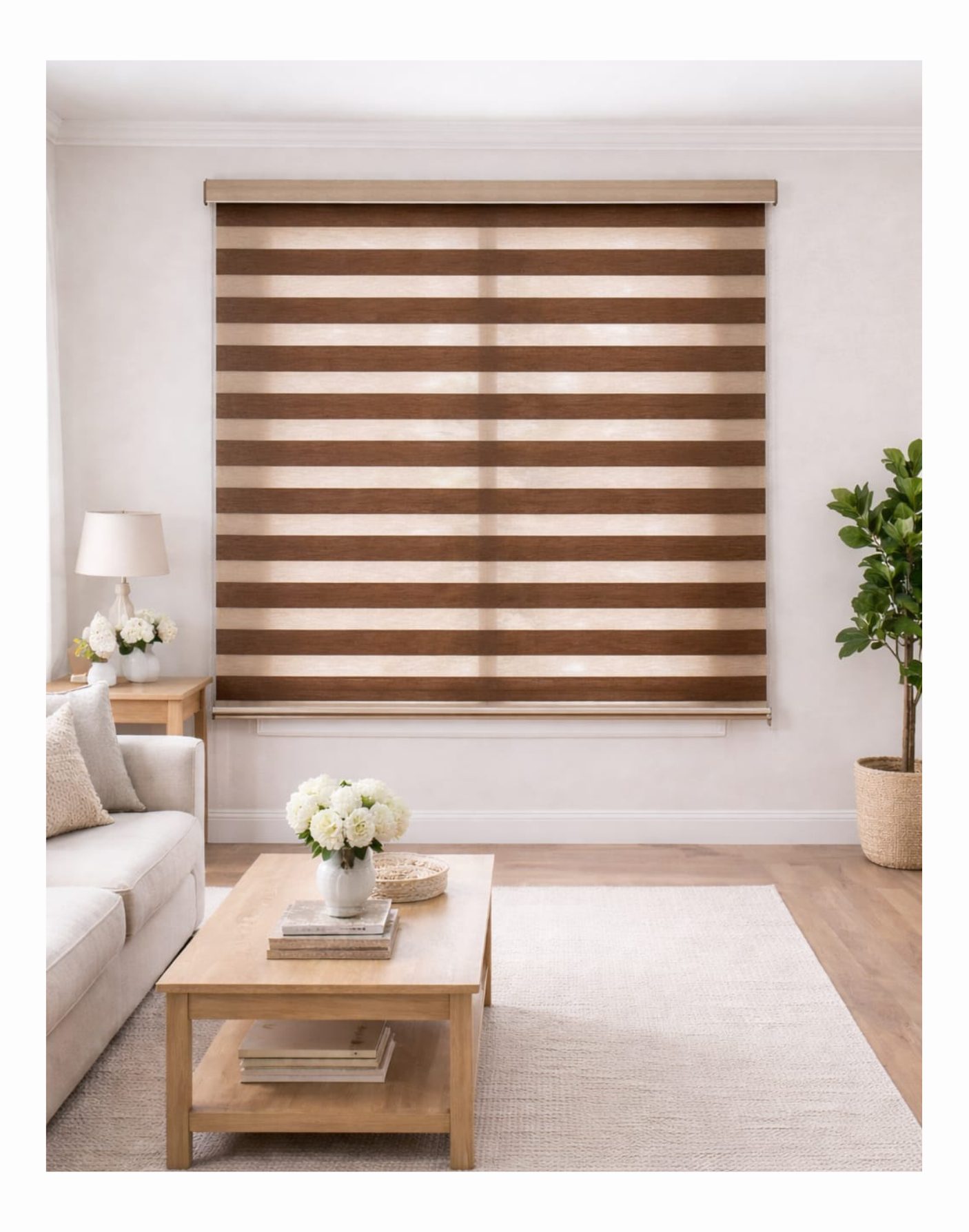 The Omega WoodLuxe Zebra Day-Night Blinds are designed for modern living, combining functionality with refined aesthetics. Featuring alternating sheer and opaque fabric bands, these blinds allow seamless adjustment between filtered light and enhanced privacy. The woodgrain-inspired finish brings a warm, premium touch, making them ideal for contemporary and elegant interiors.