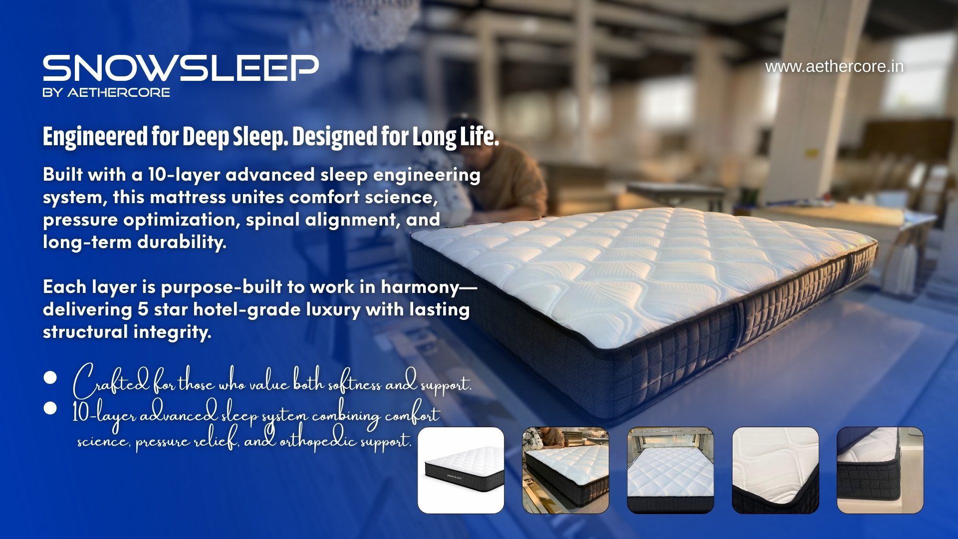 📱Order via WhatsAppThe Snowsleep Mattress by Aethercore is a premium, hotel-grade luxury mattress engineered with a 10-Layer Advanced Sleep Engineering System. Designed to deliver the perfect balance of softness, pressure relief, orthopedic support, and long-term durability, this mattress ensures deep, restorative sleep every night.