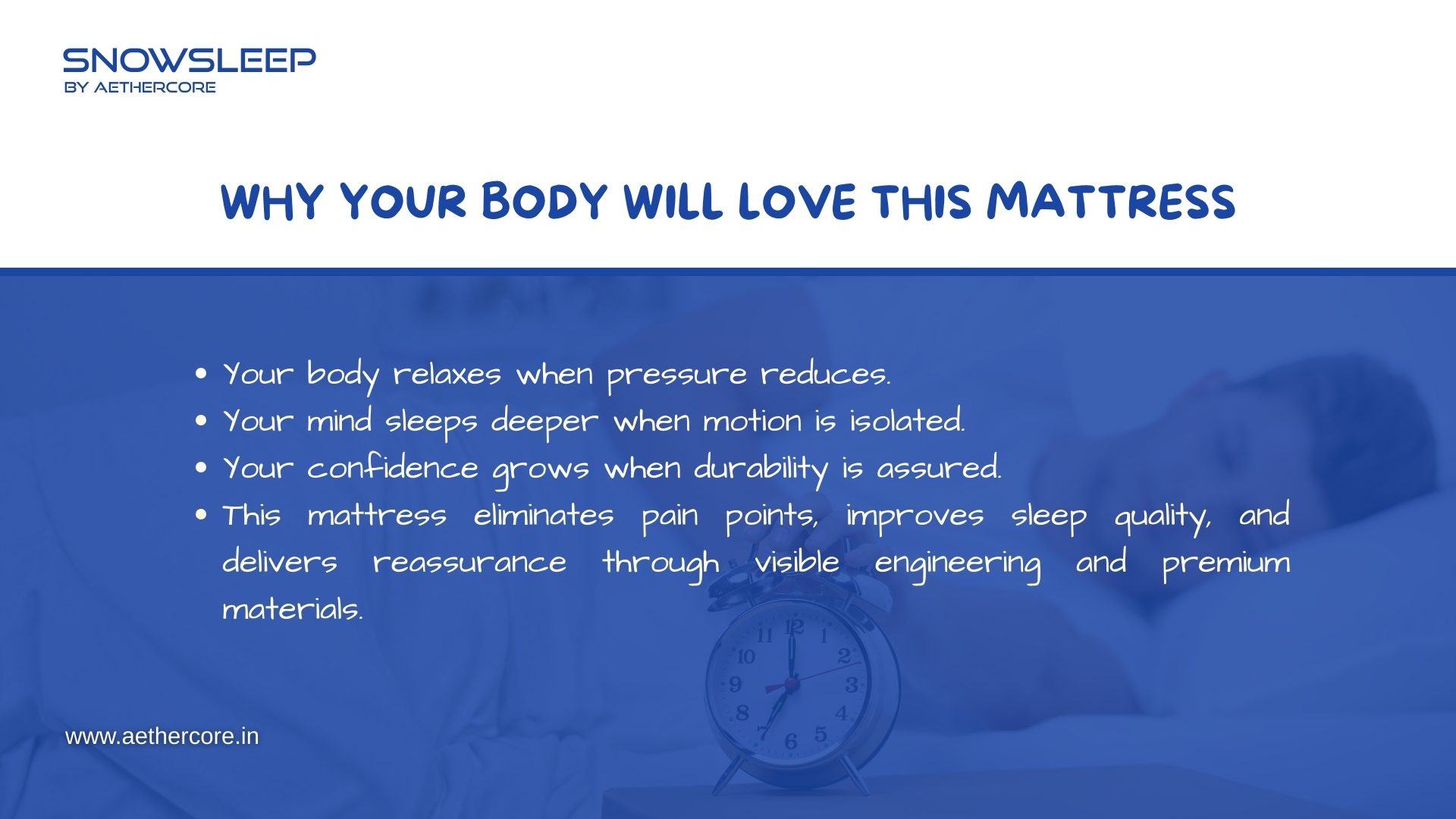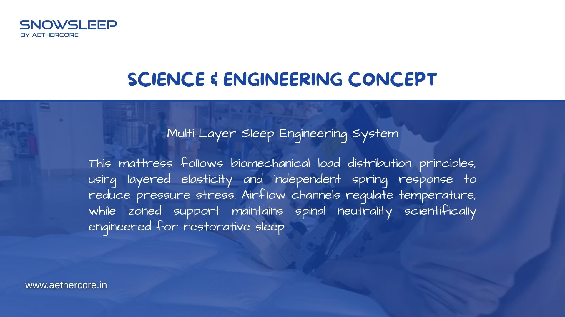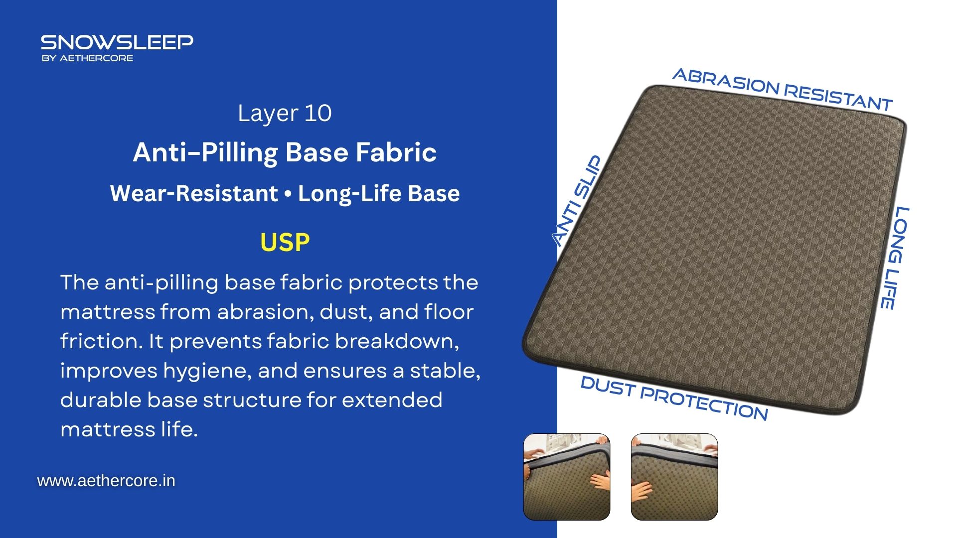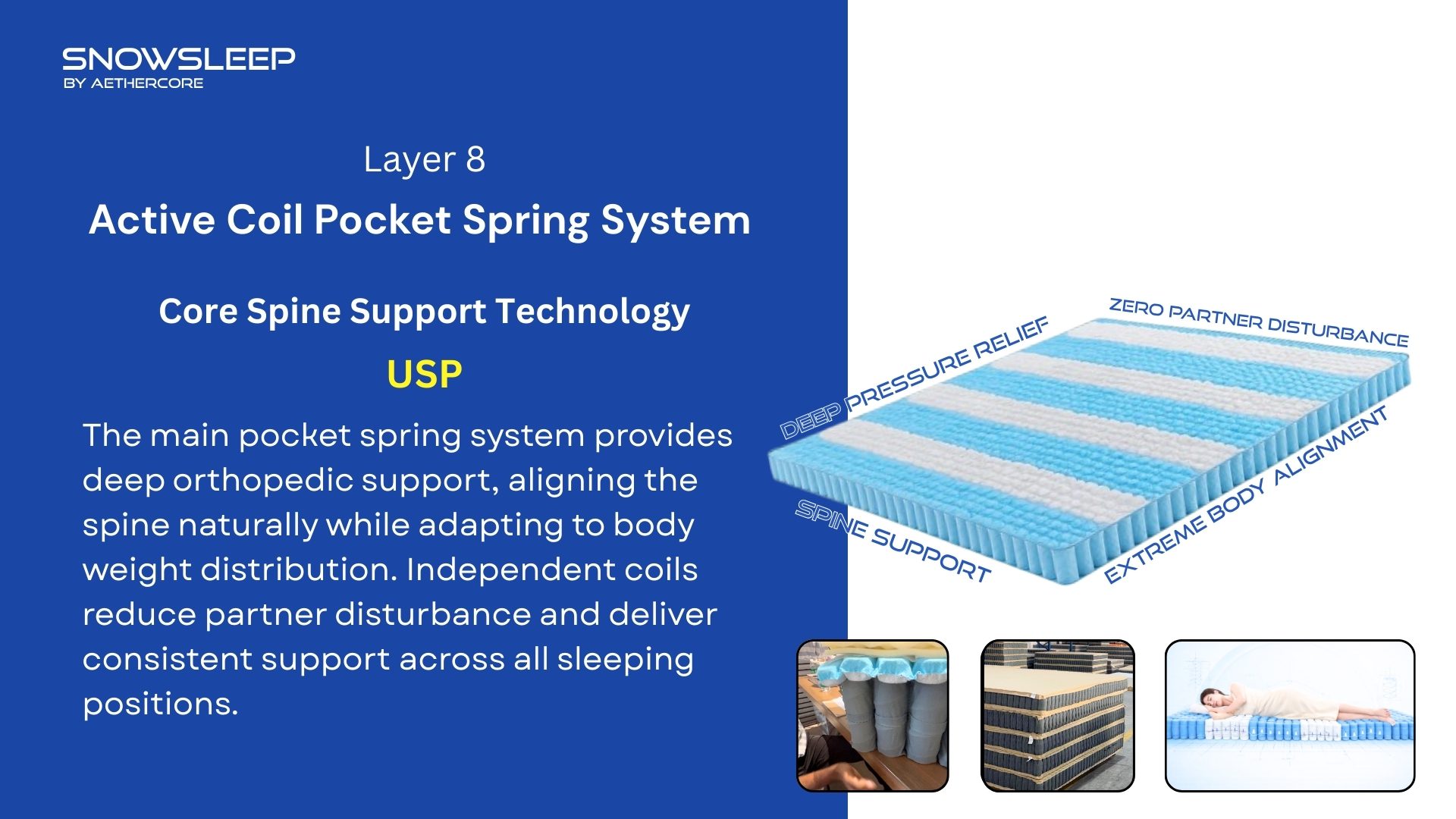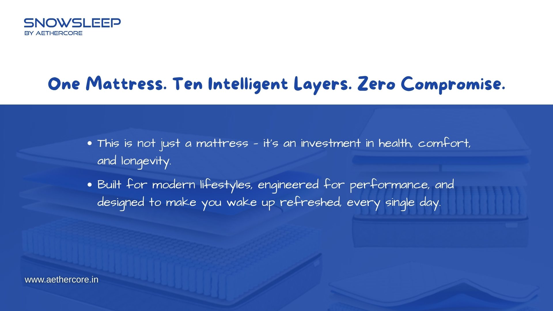 Snowsleep Mattress by Aethercore features a 10-layer advanced sleep engineering system that combines luxury comfort, orthopedic support, and long-lasting durability. Designed with dual pocket spring technology, breathable materials, and pressure-relieving foam layers, it delivers deep sleep, zero partner disturbance, and perfect spinal alignment every night.