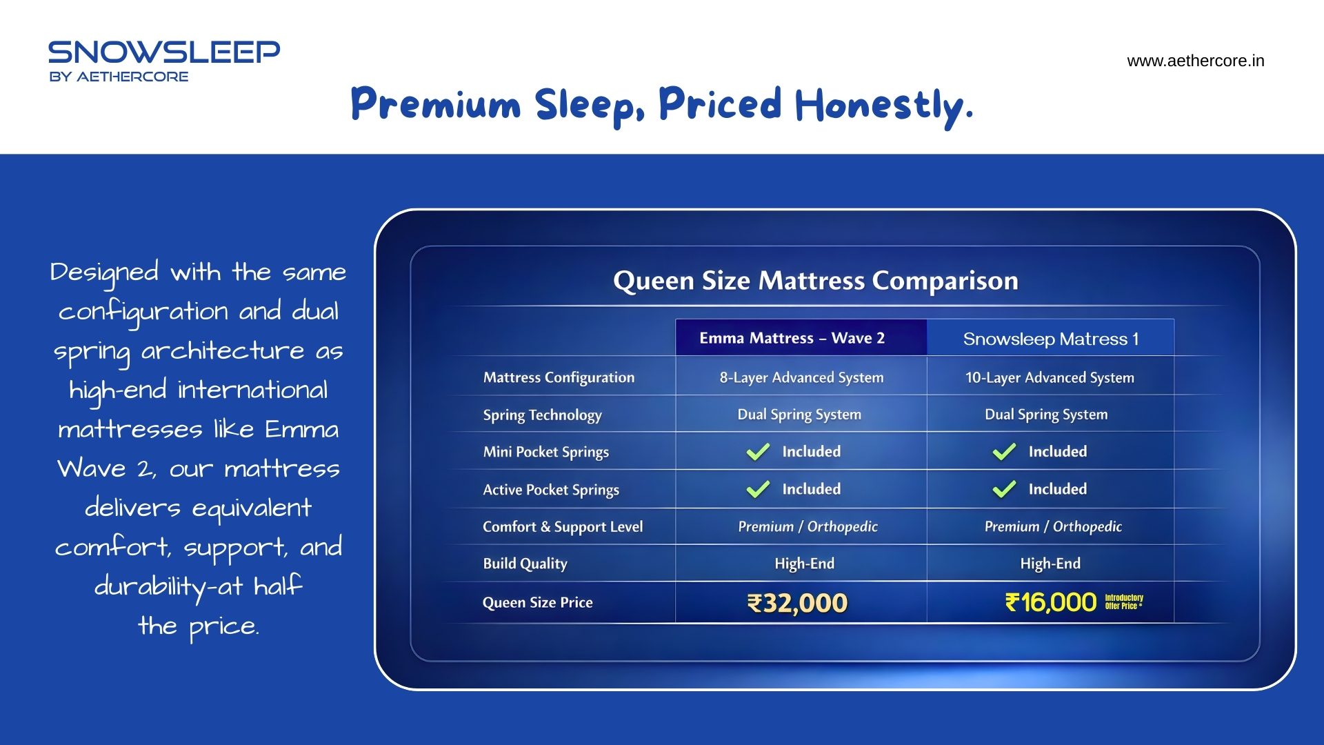 Each intelligently crafted layer works in harmony to reduce body pressure points, isolate motion, and maintain proper spinal alignment throughout the night. Inspired by international luxury mattresses like Emma Wave 2, Snowsleep delivers equivalent comfort and performance at nearly half the price — making it a smart investment in your sleep health.