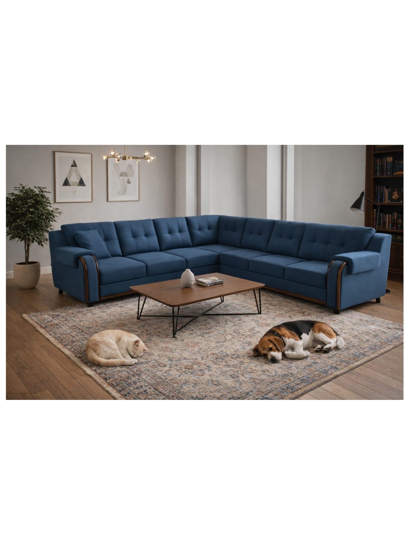 The Azure Crest Sectional by VANWOOD by AETHERCORE brings together heritage-inspired design and contemporary comfort. Its structured L-shape is enhanced with subtle button tufting and refined arm detailing, creating a piece that feels both elegant and inviting. The deep blue upholstery adds character while maintaining versatility, making it suitable for both modern and classic interiors.