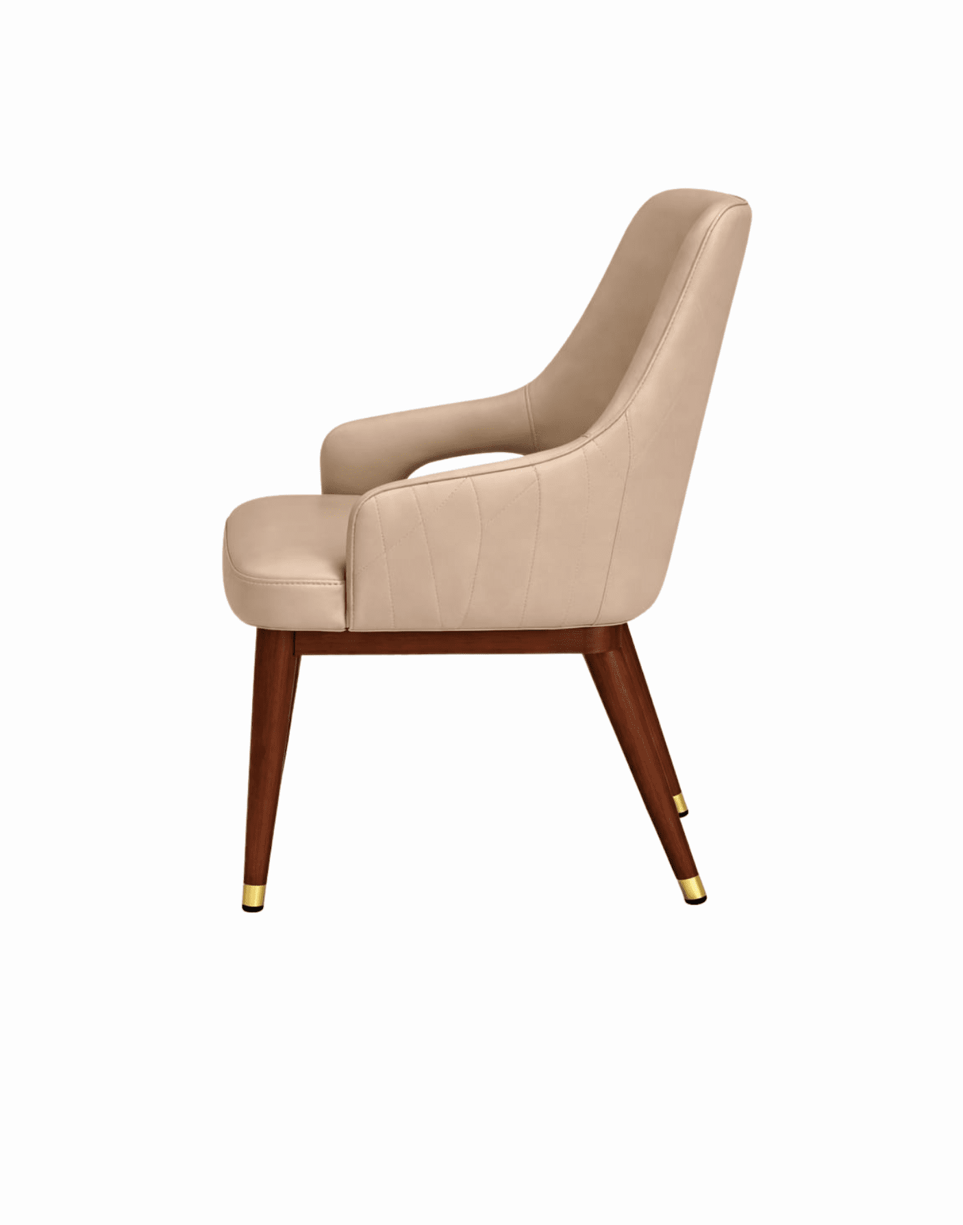 A modern acacia wood dining chair featuring premium beige leatherette upholstery and elegant gold-tipped legs. Designed with a minimalist backrest and strong construction, it offers lasting comfort and refined style for contemporary dining spaces.