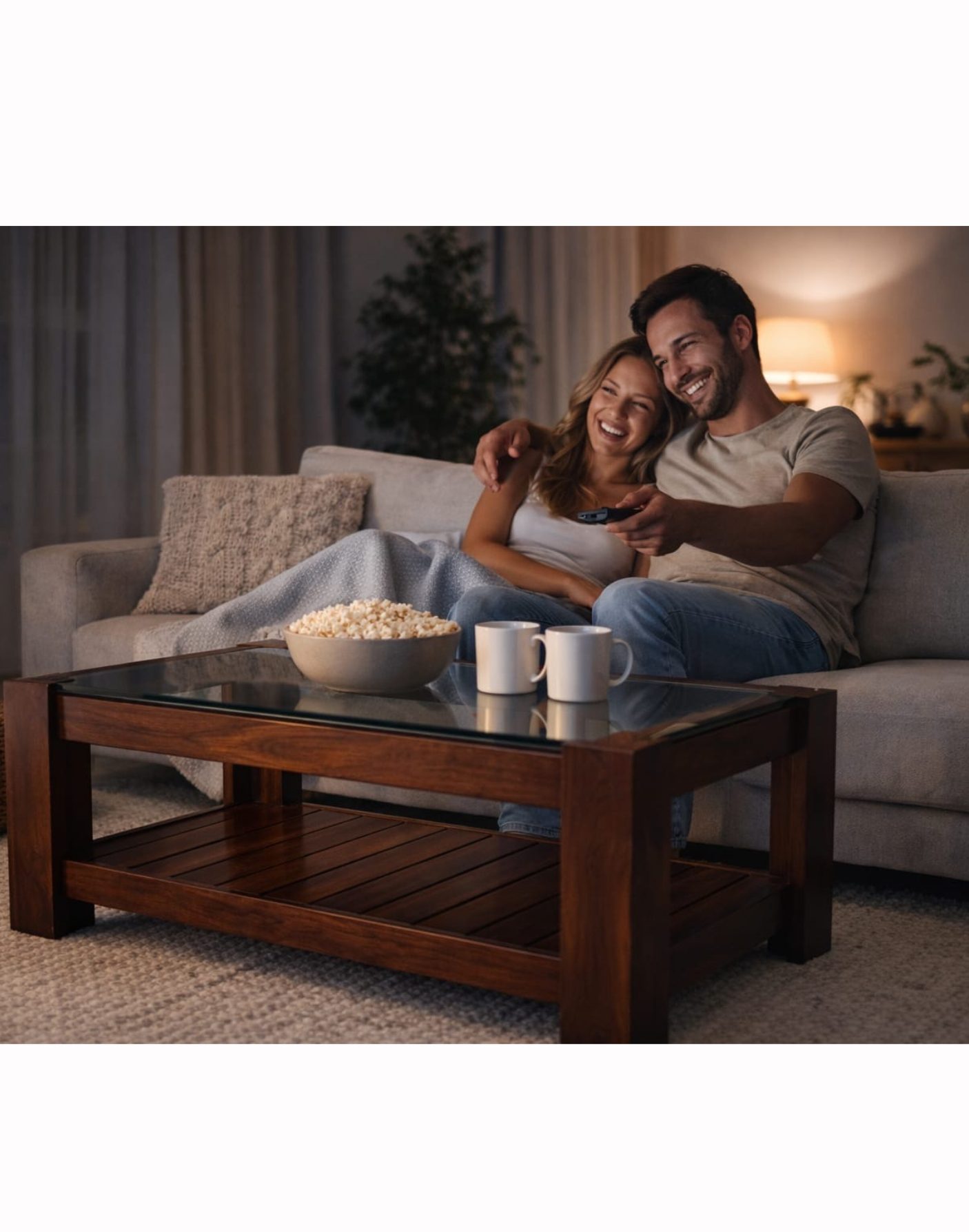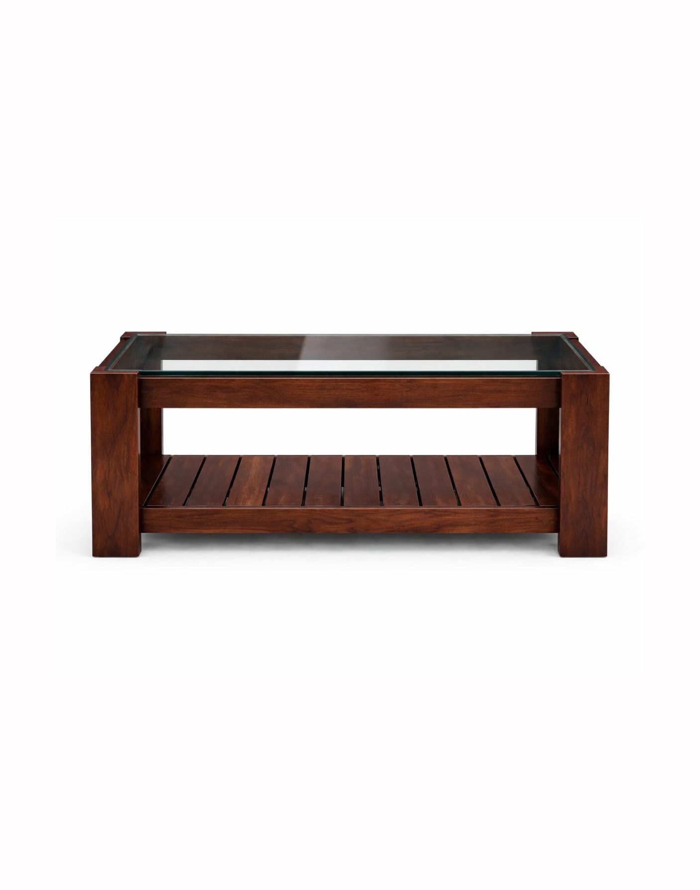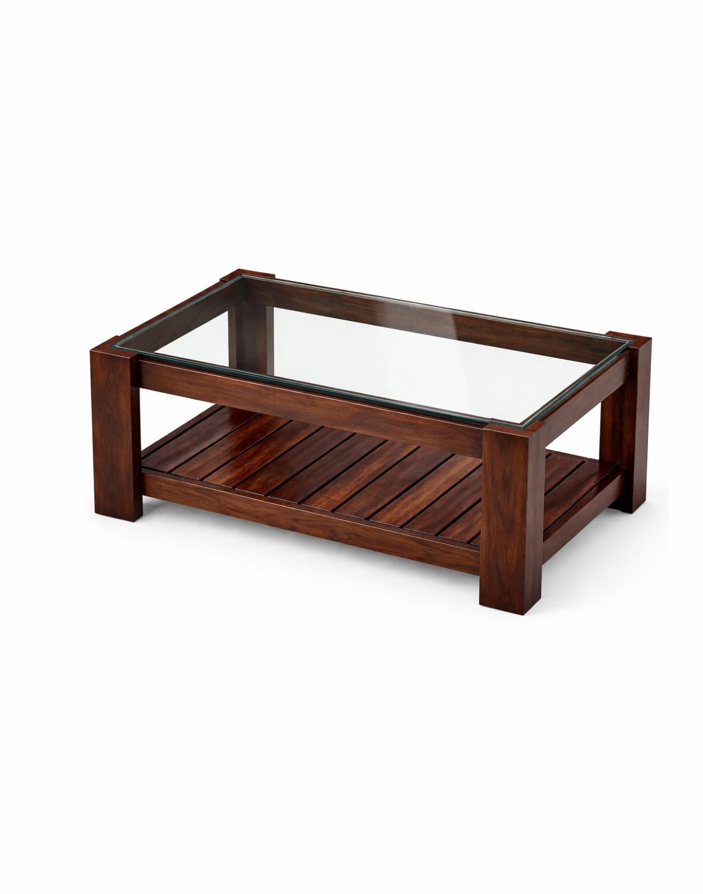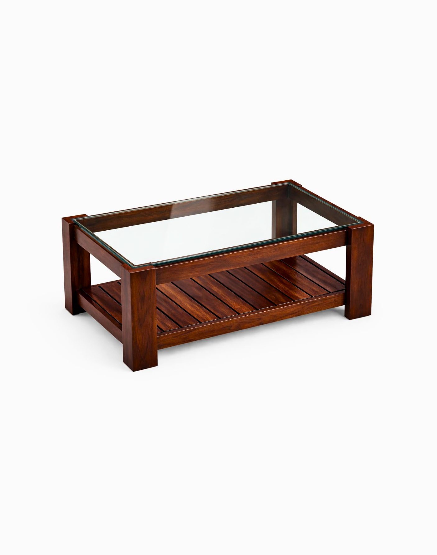Built from high-grade Teak wood, the structure offers exceptional strength and resistance to daily wear. The tempered glass top is securely fitted within a precision-crafted wooden frame, ensuring both safety and stability. The lower shelf features a slatted design for airflow and visual lightness while maintaining structural integrity.