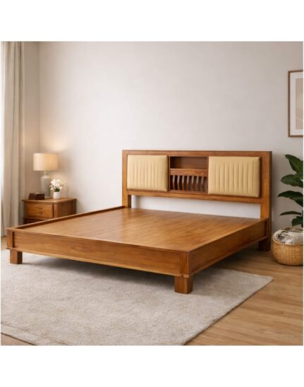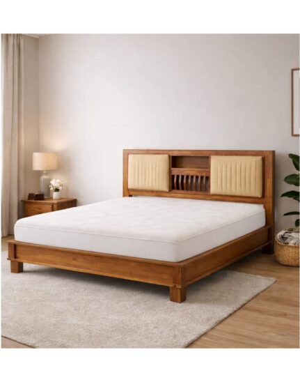 The Liora Upholstered Storage Platform Bed from VANWOOD by AETHERCORE combines elegant solid wood craftsmanship with soft upholstered comfort. Featuring a refined headboard with integrated shelving and cushioned panels, this bed frame offers both modern design and practical functionality for sophisticated bedrooms.